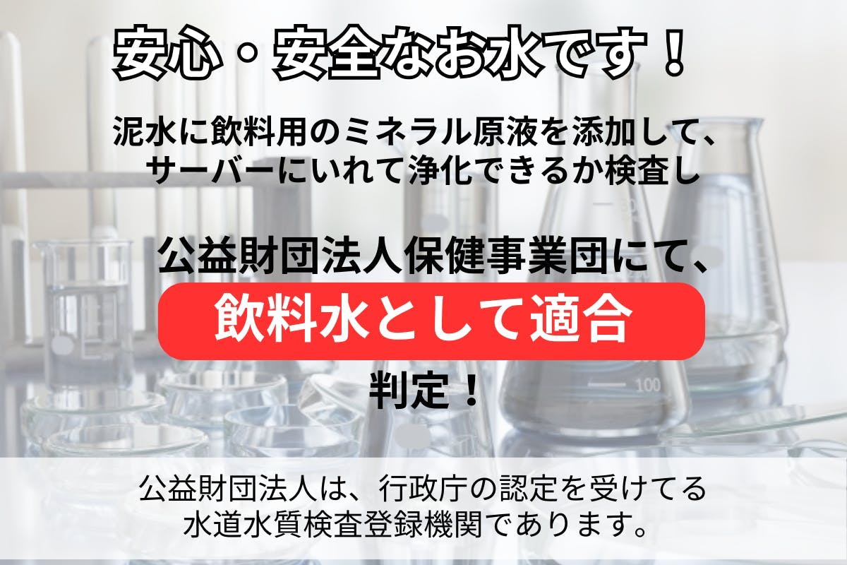 • 行政庁から水道水質検査に認定を受けている公益財団法人保健事業団にて、検査いただき「飲料水として適合」の判定がとれている安全なお水になります。