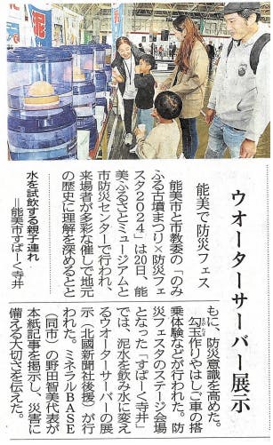 • 2024年10月20日(日)能美市防災フェスタにて、災害・断水時は泥水など自然水をろ過して飲み水に変える断水対策として次世代ウォーターサーバーをご紹介させていただき市民の皆様に大好評いただきました。