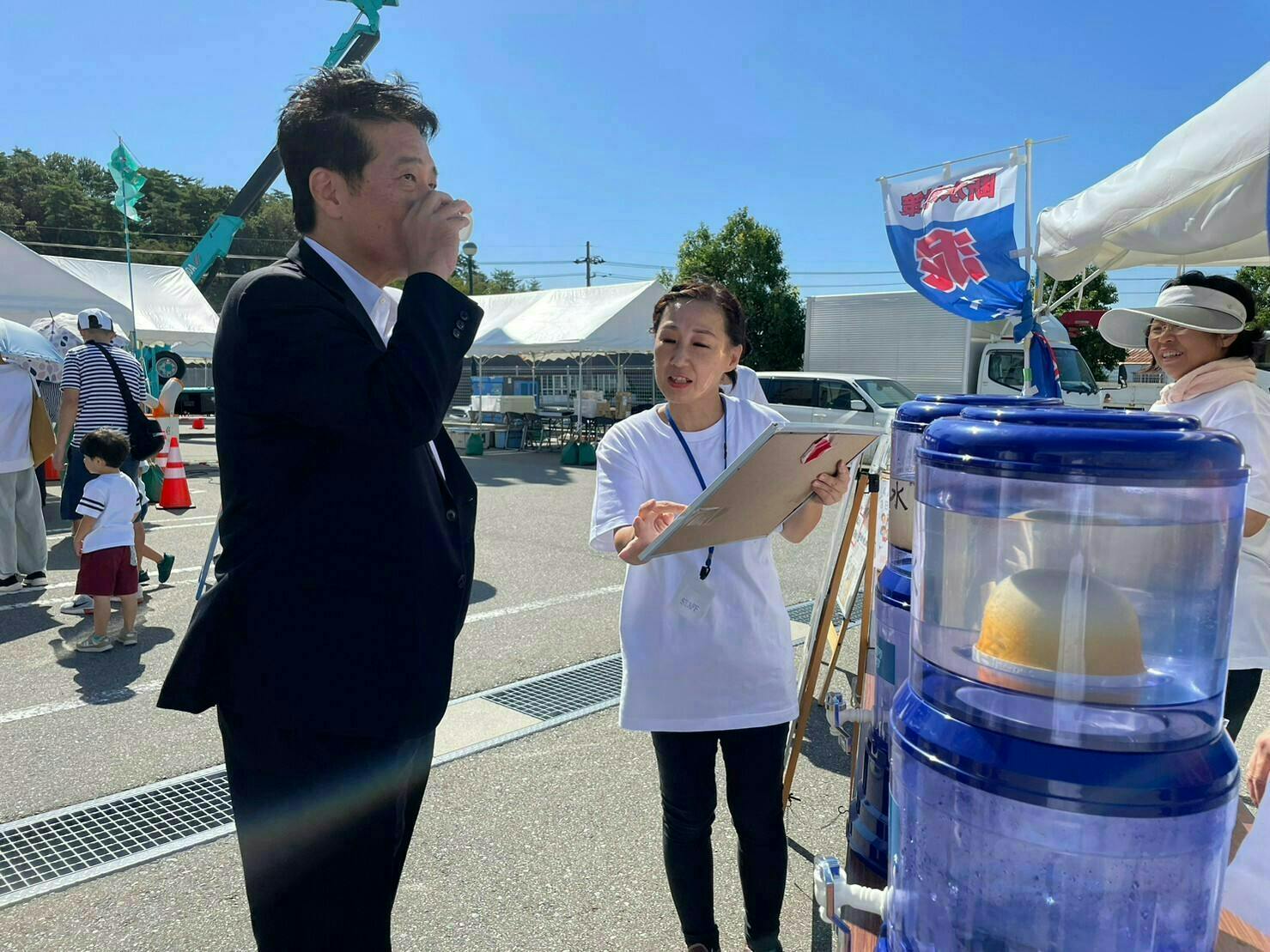 • 2023年9月24日能美市防災フェスタでは、井出敏朗能美市長をはじめ、多くの来場者に泥水でろ過したお水を試飲していただきました!