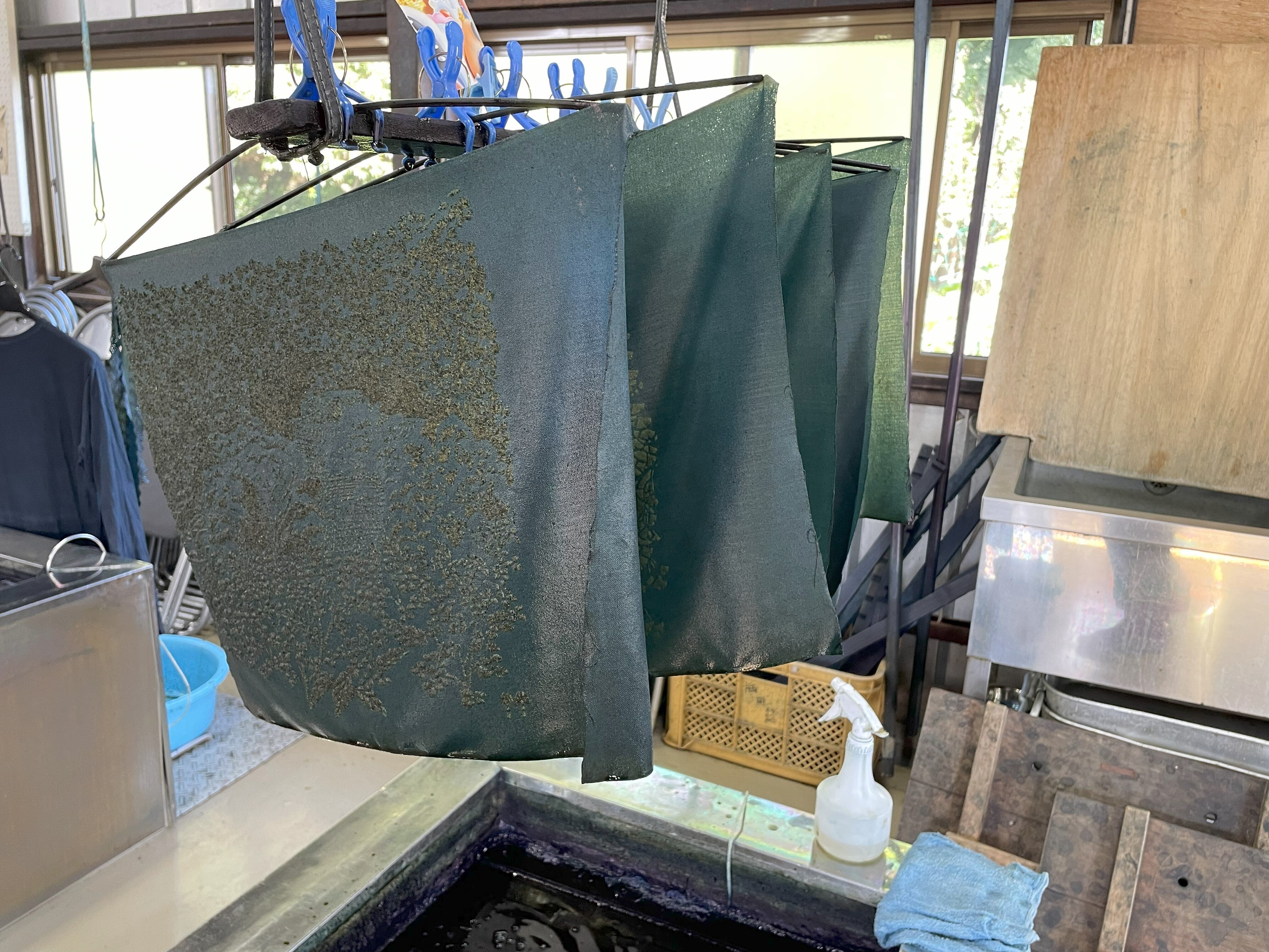 藍染の様子第29回全国報徳サミット桜川市大会や私達のクラウドファンディングの返礼品になる手拭いを藍染しているところですまた、原料になっている小麦のふすまは昔ながらの製法で作られた物を利用されています。(清水精米所で動画撮影をさせていただきました)音が迫力があります。藍染の原料はその他にお酒、灰汁(木灰)、すくも(徳島産)、ふすま皆様に返礼品として配布できるものは10月下旬に染めたものです。現場で長年藍染をされてきたAさんによると、今回の染め上りは裏面が美しいと見せていただきました。下記です。表面は以下です。どちらもいいですね!!ちなみに絵図左から 富谷観音・五所駒瀧神社・雨引観音です。藍染インタビューAさんに聞きました「一番注意していることは?」答え「藍は雑菌との闘い」清潔に保つこと。「藍の管理は何をしているのですか?」「PHの管理、温度管理」毎日天気や気温が違うので毎朝見に来て監理するそうです。一緒に作業されていたKさんから「子供を見ているのと同じよね」とのこと。仲間で集まった時も真剣で黙々と話もせずに真剣に藍に向き合って作業をしている。私も何度か現場を見に行きましたが、緊張感のある作業場でした。最近ではアメリカから、または藍染をする業者様やお子様の体験などイベントも多く受けているそうです。藍たて30度 保温は20度 とても難しいし手間のかかる作業ですが、色の落ちない先人の知恵で色落ちのないインディゴ(藍)が出来ます。拘りのある木綿で染めた絵図は竹蓋年男氏の切り絵です。今回の下巻の表紙にもご協力頂きました。是非、藍染手拭いを届けたい!!