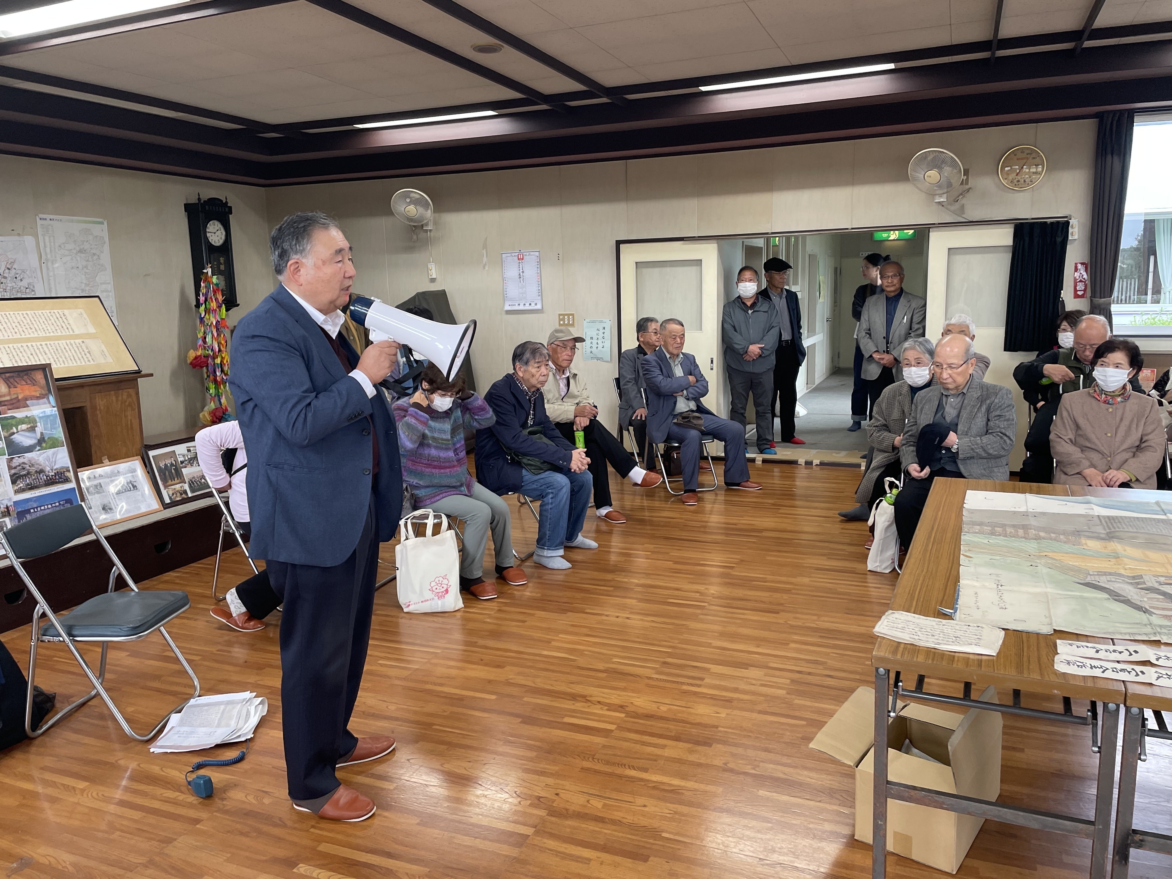 その後、桐原光明会長、廣澤光一郎、また地域の実行委員会の皆さんが文字農村集落センターで貴重な金次郎の携わった青木堰の枠組み全図、吉野白山桜を青木堰に植えた謂れを説明していただきました!!