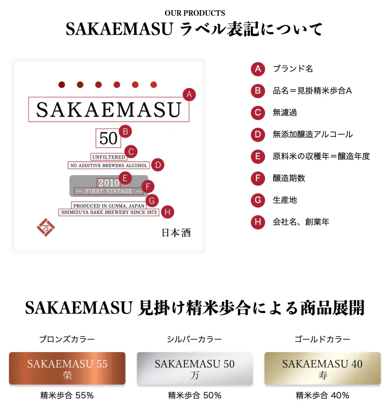 SAKAEMASU(榮万寿)の歴史は、新潟から始まります。初代は、美味しい水を求め、新潟発祥の酒造好適米「五百万石」と共に群馬県館林市にたどり着きました。諸事情により一時休蔵しましたが、六代目の手で2010年に蔵を全面改装し、ヴィンテージ日本酒「SAKAEMASU 55」と「SAKAEMASU 50」として新たに生まれ変わりました。