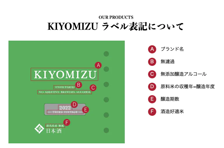 豊かな自然が生み出す清らかで美しい水と、厳選された群馬県産の米「舞風」が、清水屋酒造の六代にわたる技術と融合して「KIYOMIZU」が誕生しました。英字の「O」は滴を表しており、一滴一滴までこだわり抜く姿勢を象徴しています。