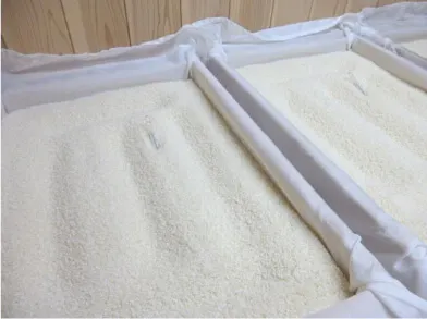 麹は「酵素のデパート」とも呼ばれ、さまざまな酵素を生成します。中でも、最も重要な役割を果たすのが、お米のデンプンを液化させる「液化酵素」と、液化したデンプンを糖に変える「糖化酵素」の2つです。この2つの酵素のバランスが、酒の味わいを大きく左右するため、麹造りは非常に慎重に行われます。私たちは、この大切な麹造りにおいて、縦70cm×横50cm×高さ9cmの木箱に約10kgずつ小分けし、伝統的な「箱麹法」を採用しています。この方法では、細やかな温度管理を徹底しながら麹菌の繁殖を促し、最高の麹米を育て上げます。手間ひまを惜しまず、一つひとつ丁寧に作られた麹が、弊社の酒に豊かな風味と深い味わいをもたらします。