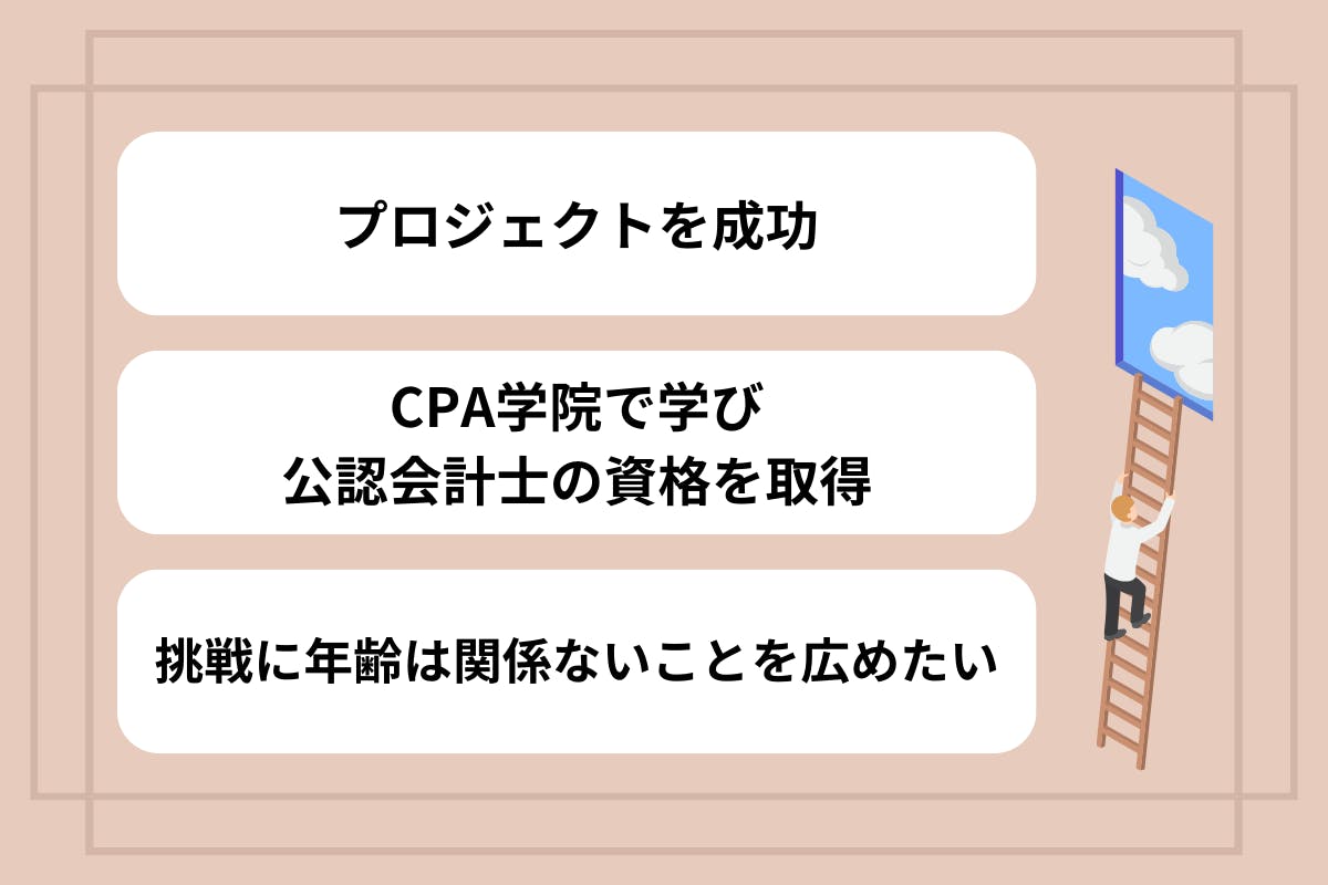 このプロジェクトを通じて、私が公認会計士を目指し、成し遂げることで、「どんな状況からでも変わりたいと思った時から、新たなキャリアを築くことができる」という事を皆さんに証明したいです。