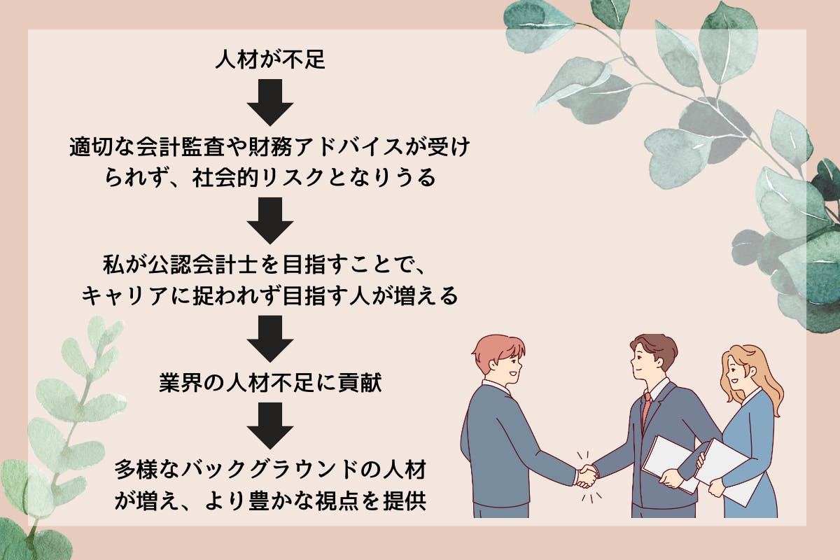 私が公認会計士を目指すことで、少しでもこの人材不足に貢献し、特に女性がこの業界でのキャリアを築くことの重要性を示したいと考えています。