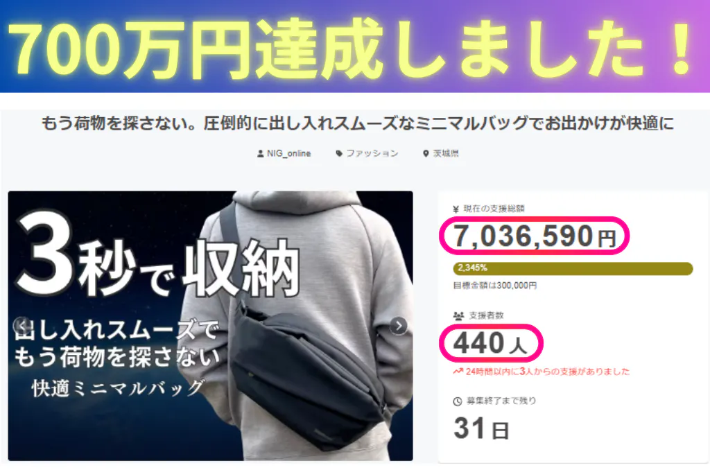 プロジェクトですが、支援総額700万円、支援者400名を超えました。