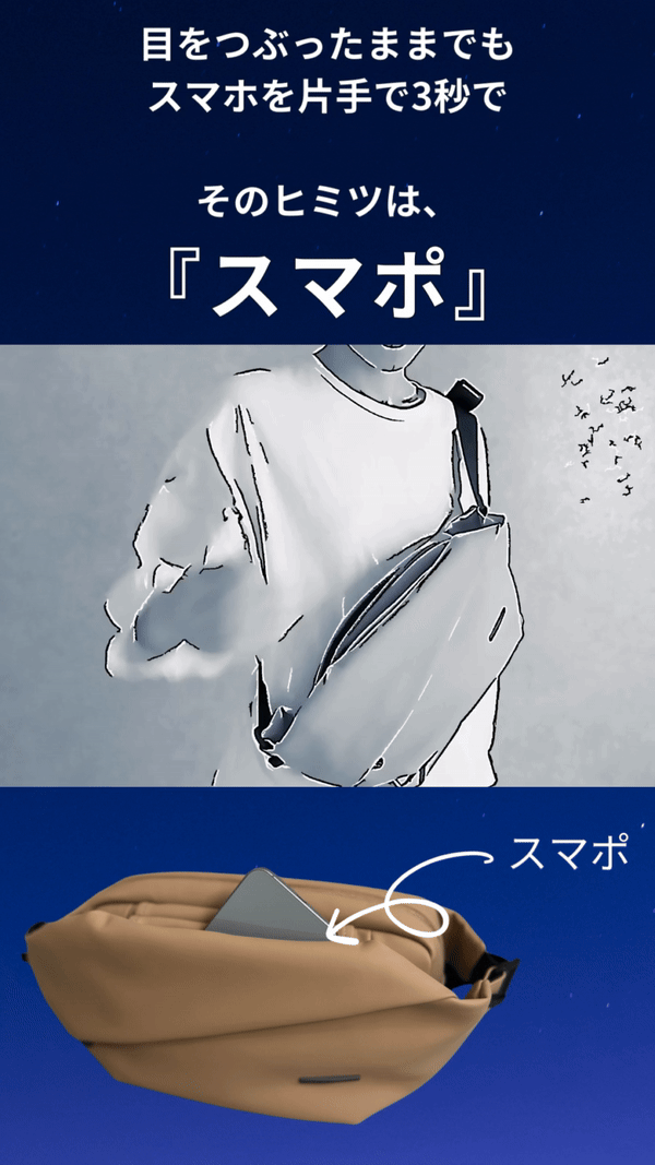 頻繁に使うものだから、ストレスなく、"最短最速"で出し入れができるようにしたスマホ専用のポケット「スマポ」。