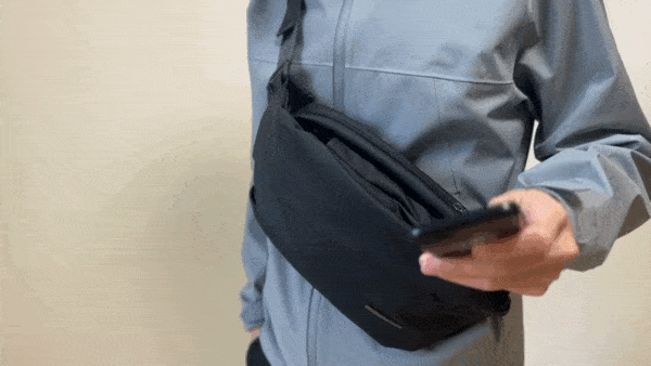 ファスナーレスだから開け閉めの必要なく、そのまま手を入れるだけでスマホを取り出す。