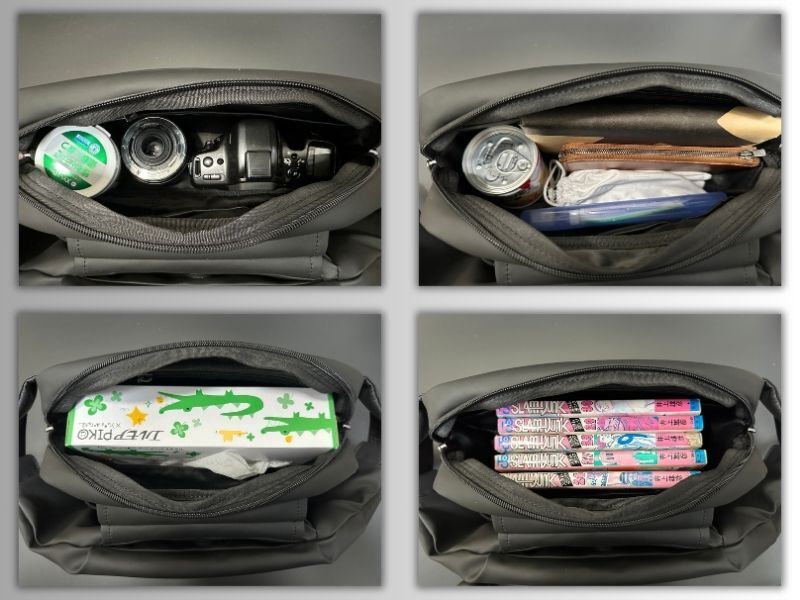 ミラーレスカメラ、ポーチ、メガネ、おやつ、マンガ本にティッシュBOXまで、大きめの荷物が収納できます。