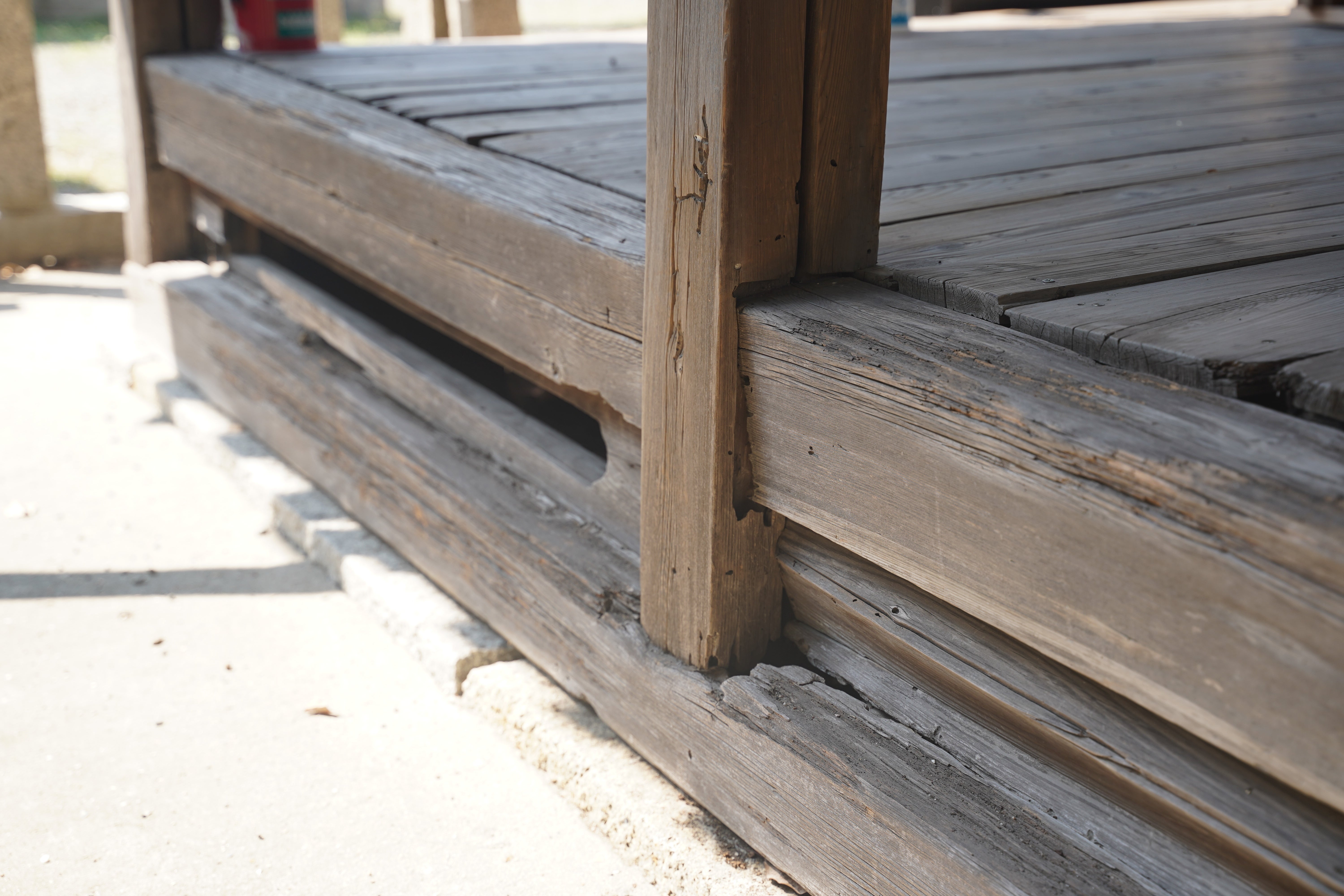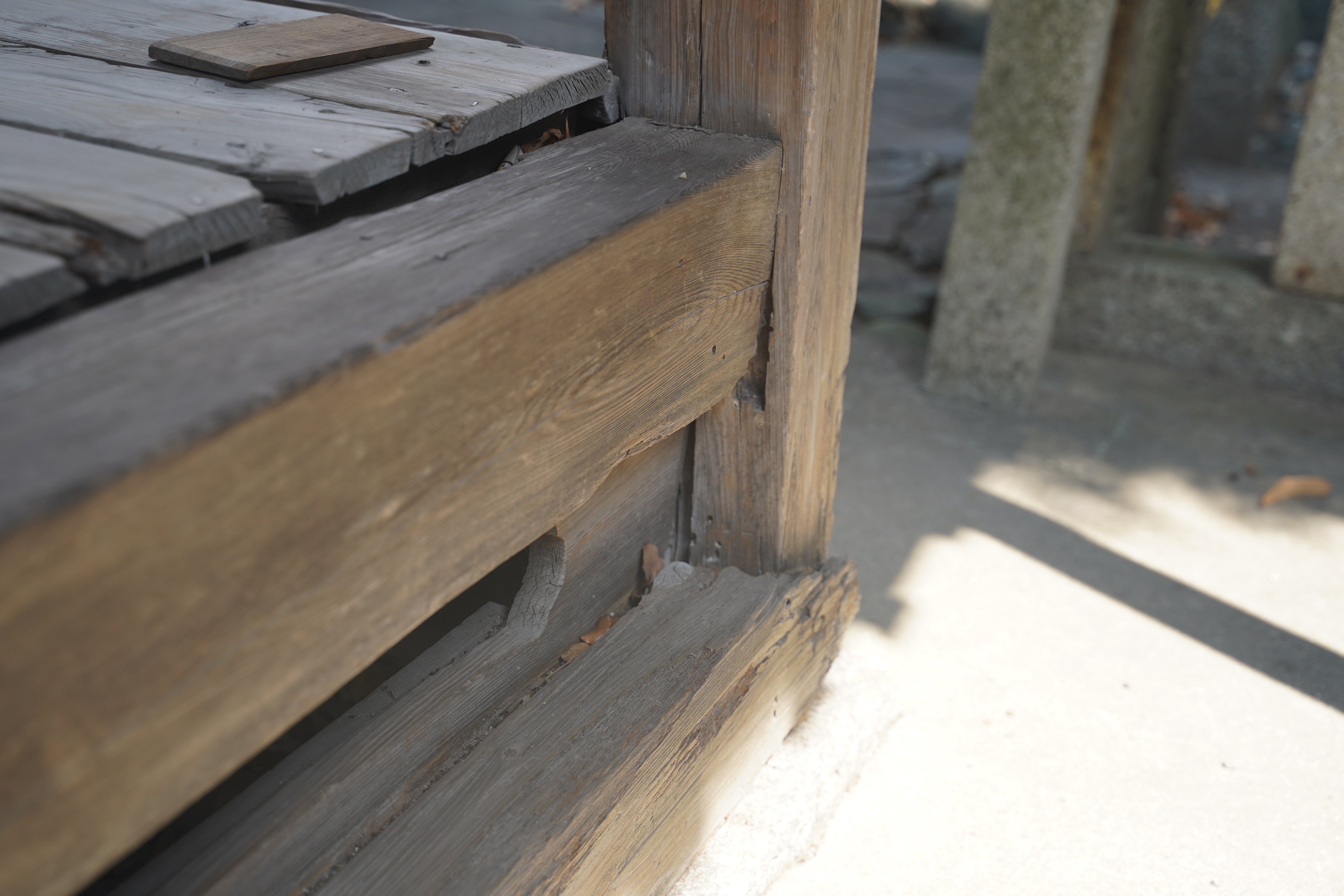 (今回の改修では神楽殿の床の全面的な改修を想定しております。雨風による腐食が進み、床に足をとられかねないような危険な箇所が複数ございます。)
