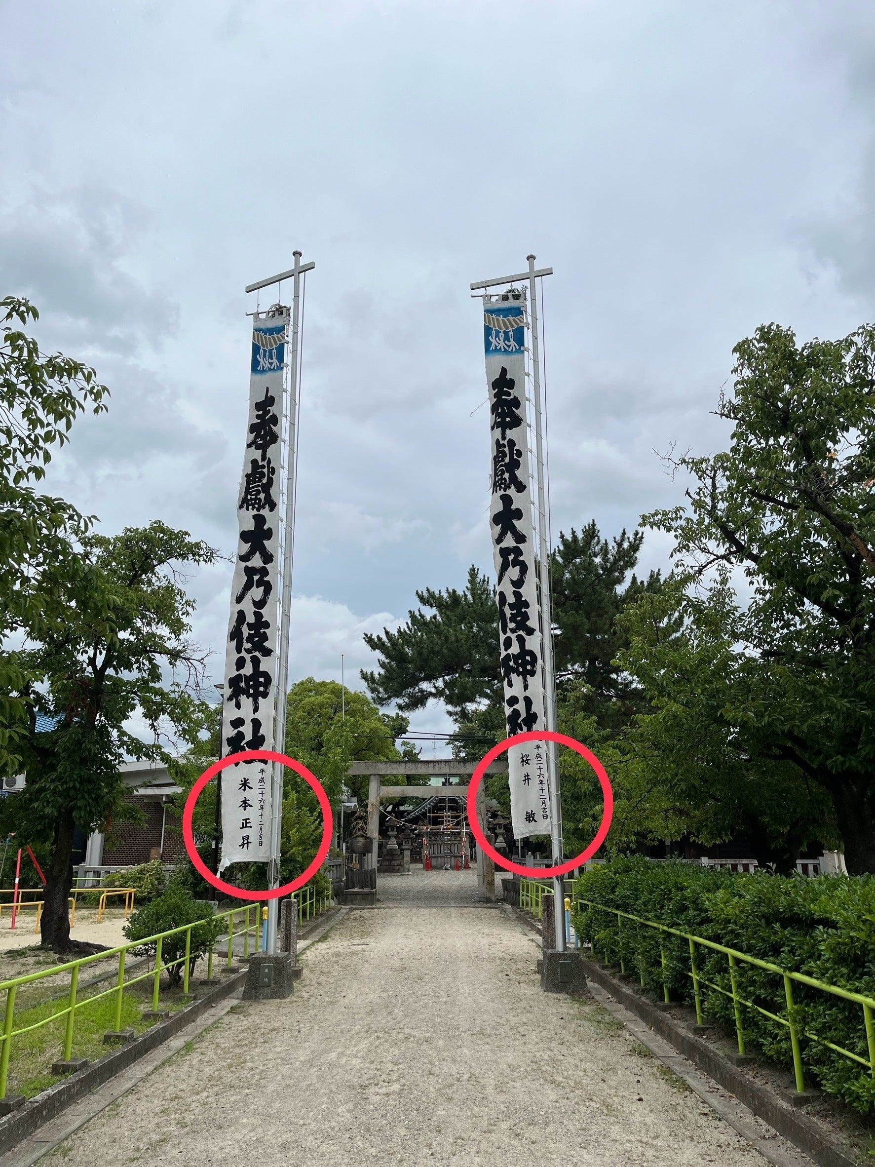 大乃伎神社の鳥居手前に立つ幟旗の下部に、お名前を刻ませていただきます。神社の歴史に名を留める、特別で貴重な機会となります。