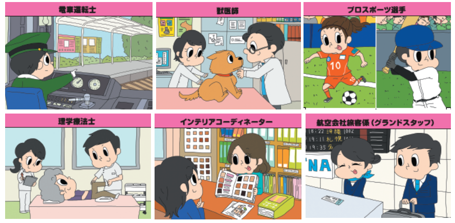 72種類ある職業カードのイラストから「やってみたい」と思うカードを選ぶことで、楽しみながら自分の興味の方向性、自分の強み、様々な職業の特徴について理解を深めることができ、現在では、小・中学生のキャリア教育授業で活用される他に、高校や大学等の就職支援、特別支援学校、就職支援施設、地域のキャリア教育イベント、企業における職場体験など、幅広い場面で活用されています。