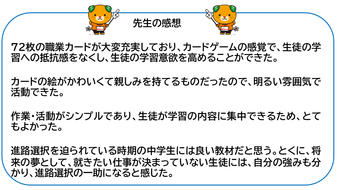 また、全国のキャリア教育に携わる先生等から問い合わせをいただいている。