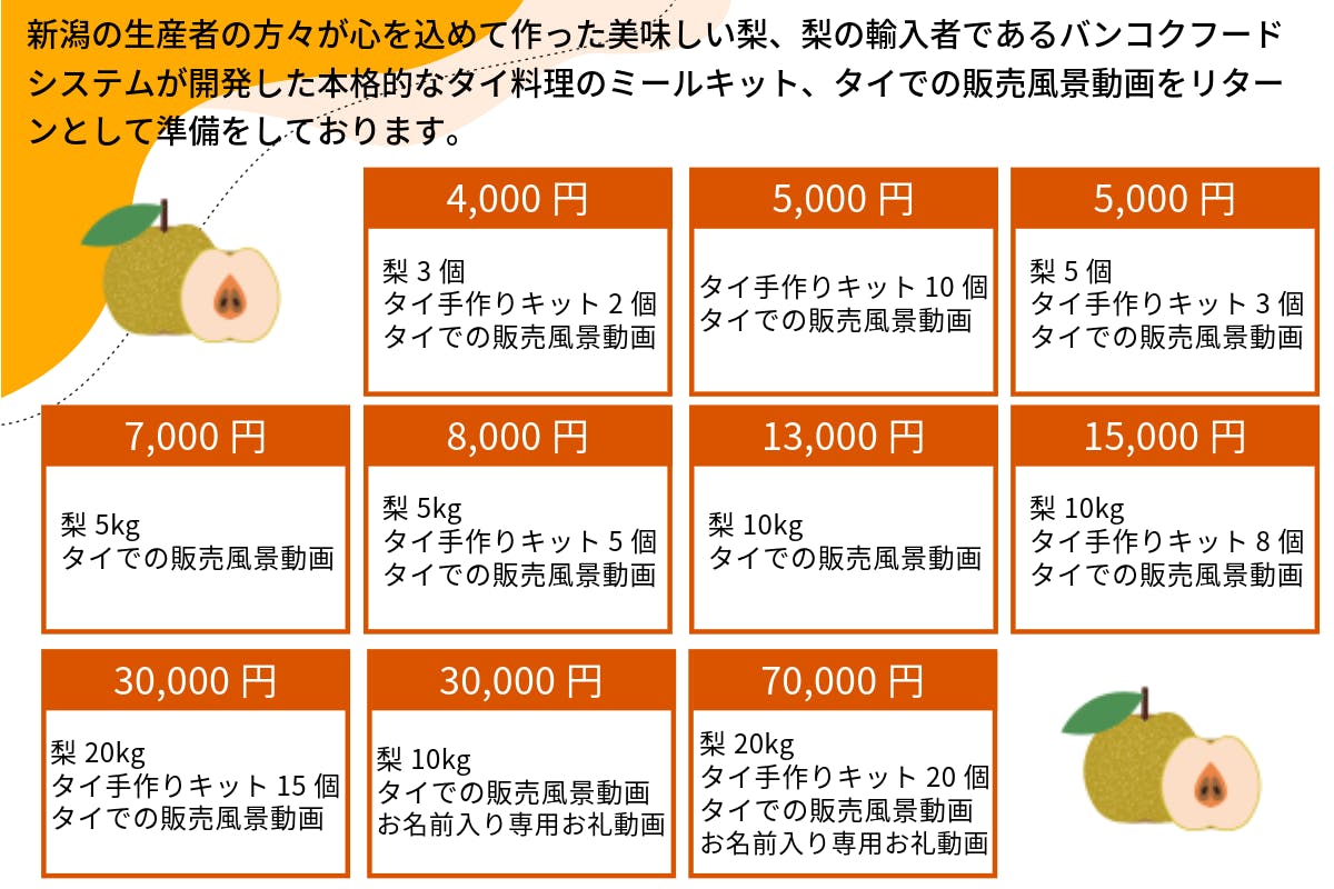 ご支援いただいた資金については、新潟県の梨の素晴らしさをタイ国内で最大限PRするため「試食販売エリアの設営、運営費用・販売員の人件費・SNSでの広告費」などの販売促進費用に活用させていただきます。