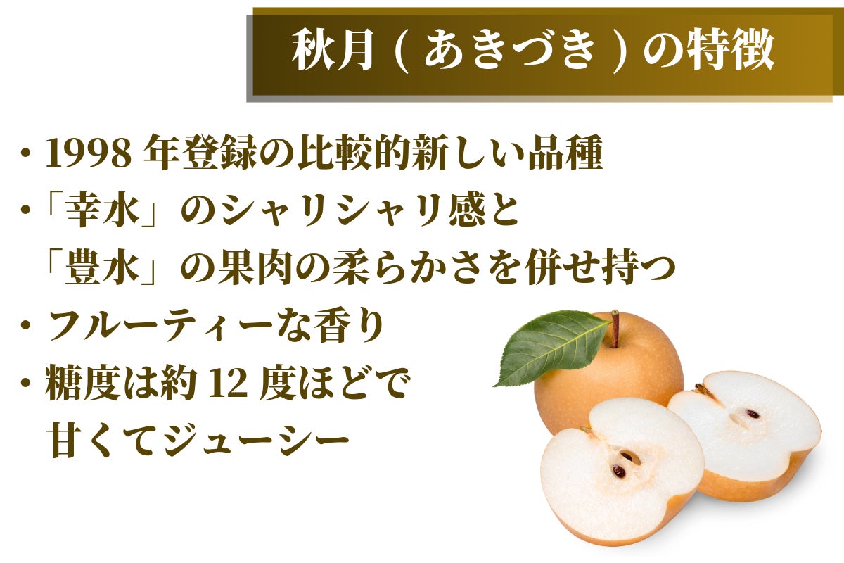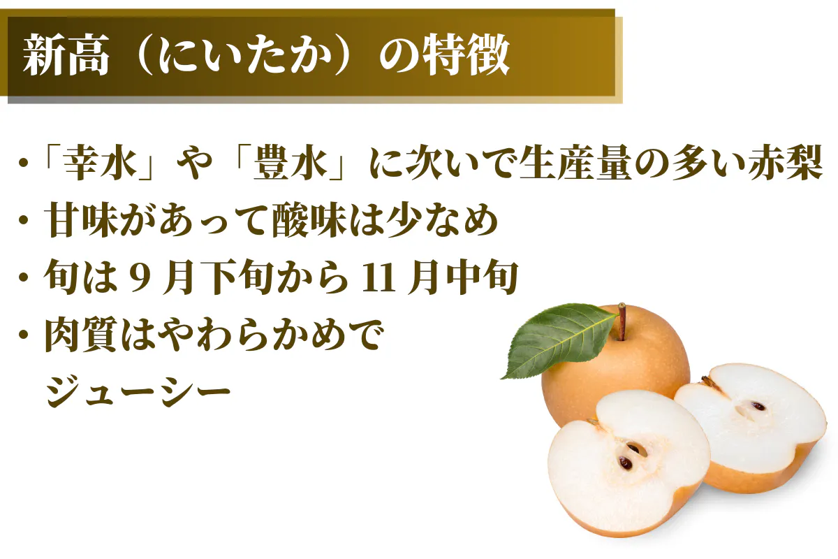 「新高」は「幸水」や「幸水」に次いで生産量の多い赤梨で、日持ちが良くジューシーな甘さが広がる梨です。また「秋月」は「幸水」と「にっこり」を掛け合わせて作られた品種で近年人気が出てきている美味しい梨です。