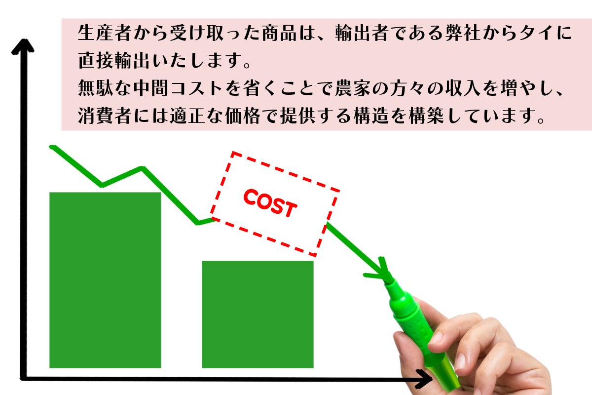 私たちはいくつかの生産団体とパートナーシップを結び、互いに知恵を出し合い出荷計画を策定、市場価格に左右されない安定した価格で取引を行い、輸出先国の中間層の手にも届く適正価格での輸出に取り組んでまいりました。