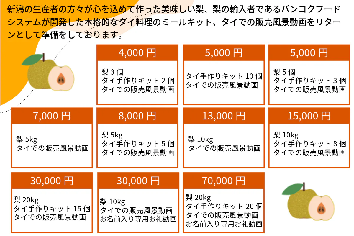 クラウドファンディング後は、新潟県の梨のタイ国内での定着を目指し、店頭・インターネット販売の継続した販売活動を進めたいと考えています。