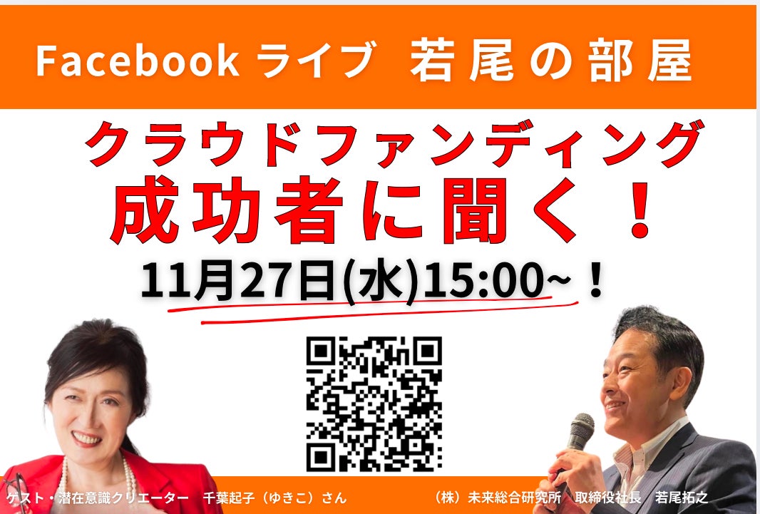 ◇◆本日11月27日(水)15時~若尾の部屋【クラウドファンディング成功者に聞く】ゲストは千葉起子さんです◆◇
