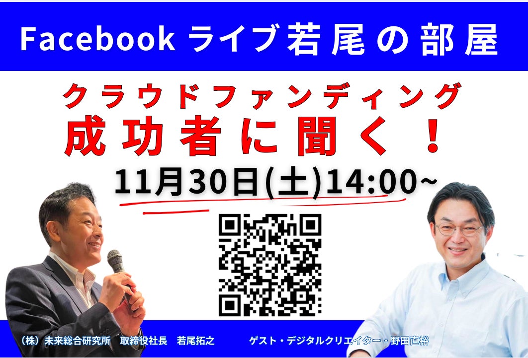 ◇◆11月30日(土)14時~若尾の部屋【クラウドファンディング成功者に聞く】ゲストは、野田直裕さんです◆◇