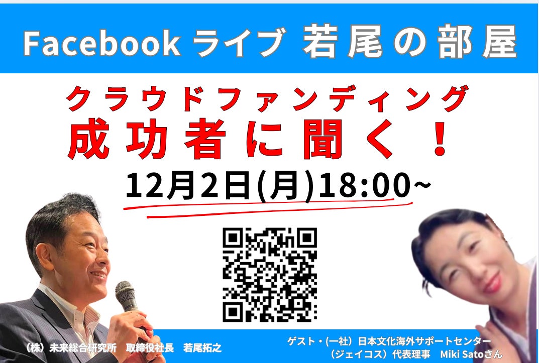 ◇◆12月2日(月)18時~若尾の部屋【クラウドファンディング成功者に聞く】ゲストはスペイン在住で一般社団法人 日本文化海外サポートセンター(ジェイコス)代表理事の佐藤みきさん◆◇