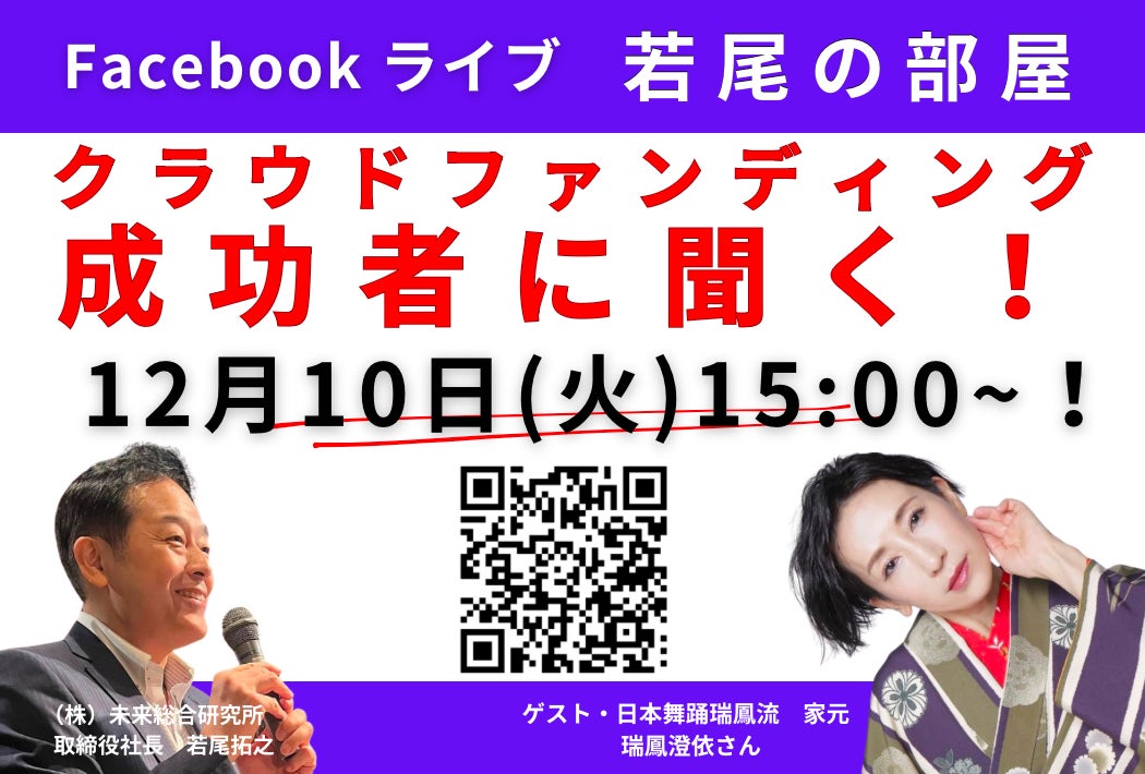◆◇本日12月10日(火)15時からのフェイスブックライブ若尾の部屋「クラウドファンディング成功者に聞く」のゲストは日本舞踊瑞鳳流 家元の瑞鳳澄依さん◇◆