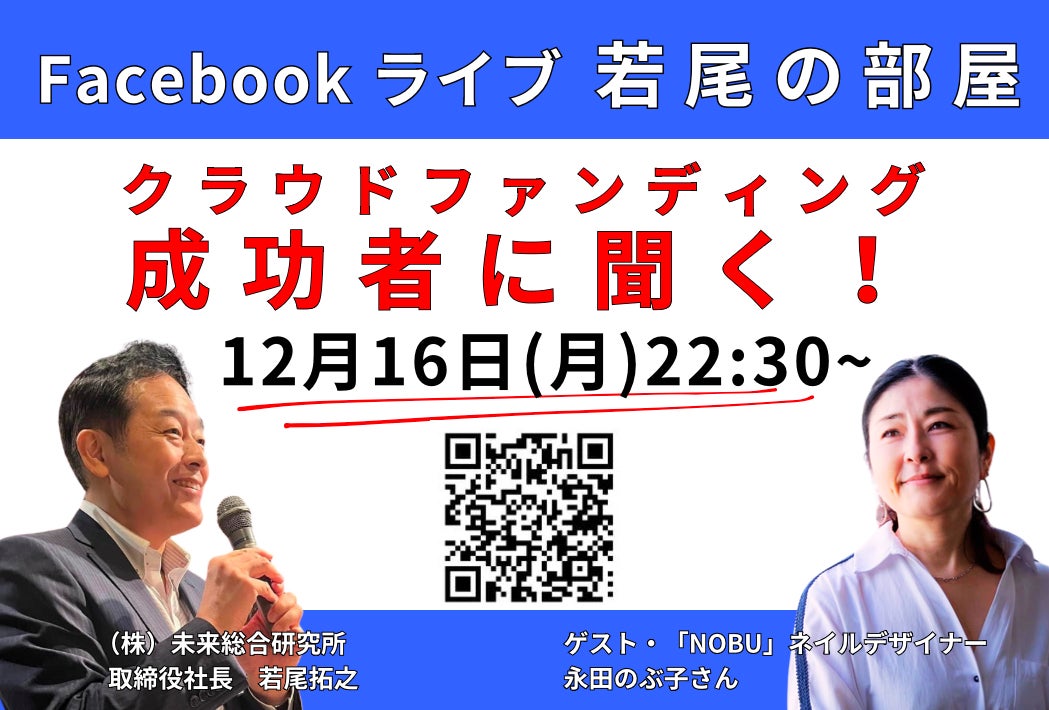 ◇◆12月16日(月)22時30分~若尾の部屋【クラウドファンディング成功者に聞く】ゲストは、ネイルデザイナーの永田のぶ子さん「NOBU」◆◇Facebookライブ開催。