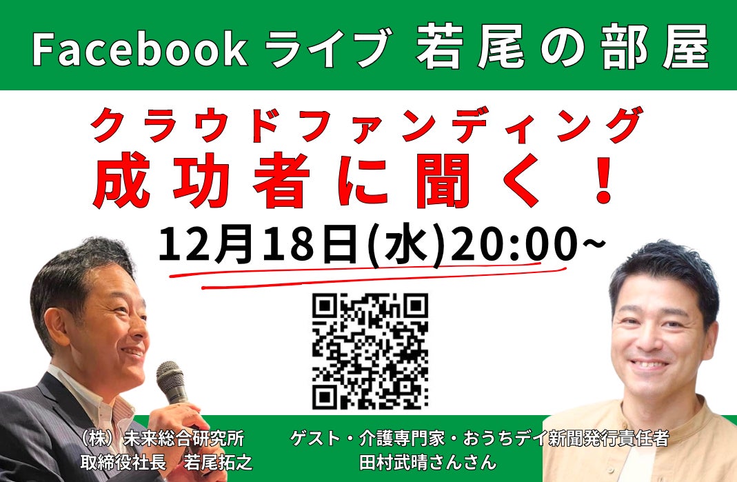 ◆◇本日12月18日(水)20時からのフェイスブックライブ若尾の部屋「クラウドファンディング成功者に聞く」のゲストは介護専門家でおうちデイ新聞発行責任者の田村武晴さんです◇◆