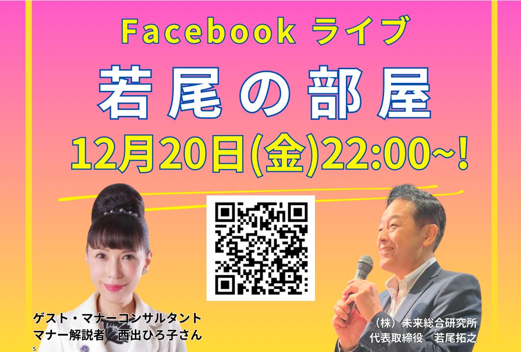 Facebookライブ 『若尾の部屋』ゲストはマナーコンサルタント、マナー解説者の西出ひろ子さんです。