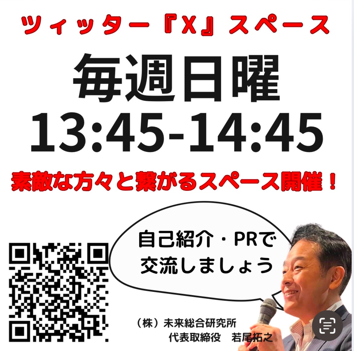 13:45〜 ツィッター [X] スペース『若尾の部屋』 自己紹介・PRお待ちしてます、楽しく繋がろう!