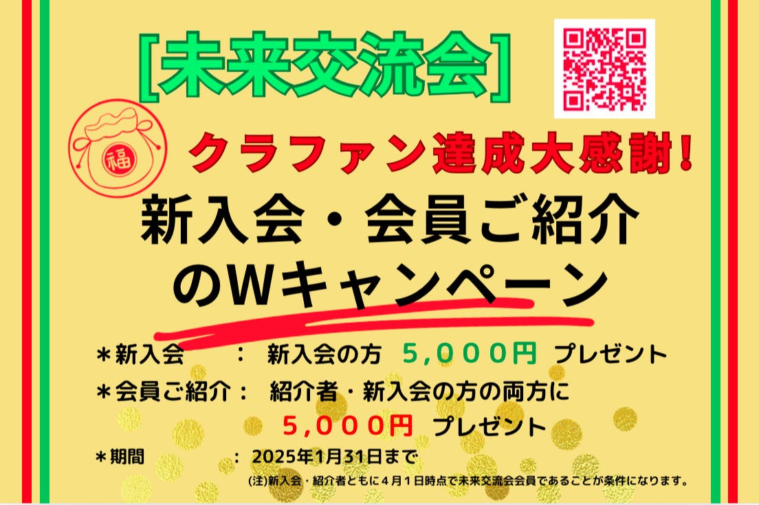 【未来交流会】の新入会&会員ご紹介のWキャンペーンです。