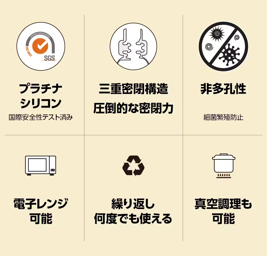 当社の製品は空気との接触を最小限に抑え、水分の蒸発防止により、食べ物をより新鮮に保存することが出来ます。
