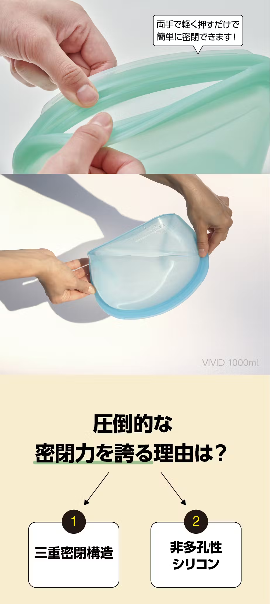 シリコン性のバッグならではの三重密閉構造の技術力!