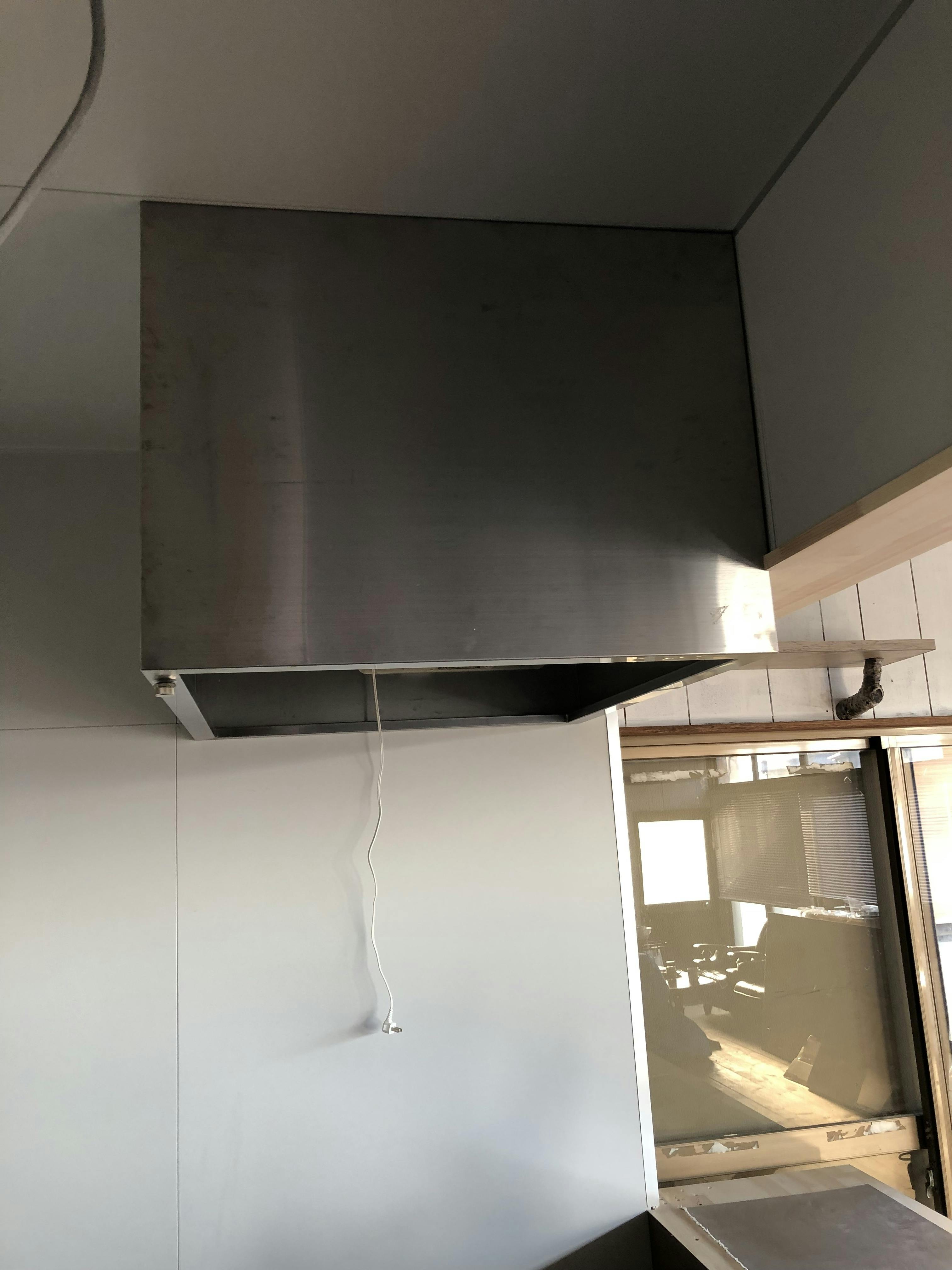 ▲ステンレス製のレンジフード、ヤフオクでちょうどいいサイズがあったので購入!(送料込みで5万くらい)オーダーだと10万超え必至だったのでいいサイズのがあって良かったです。単品だと一番高価な買い物かも(^^;