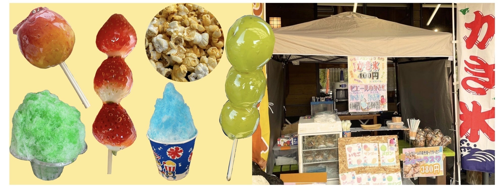 宮崎県限定で1日テント出張出店!合計50個(夏限定かき氷、シャインマスカット飴、いちご飴、りんご飴、ポップコーン)の商品をチョイスして持っていきます。