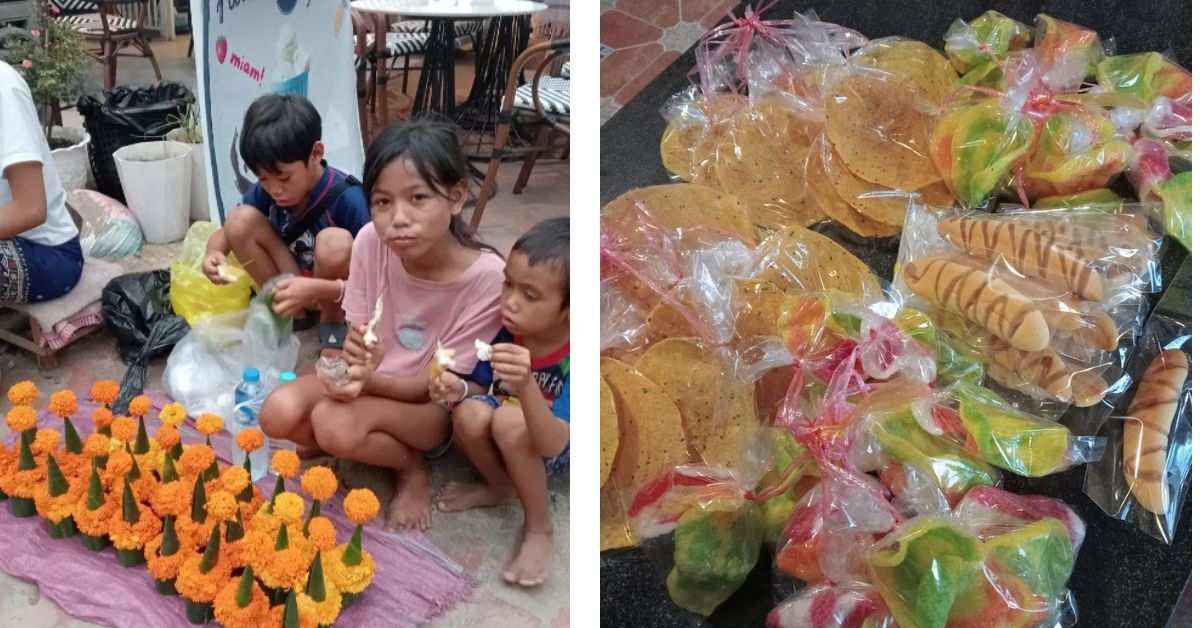 子ども達はナイトマーケットでお供えのお花を売ったり、お菓子を売ったりして収入を得ています
