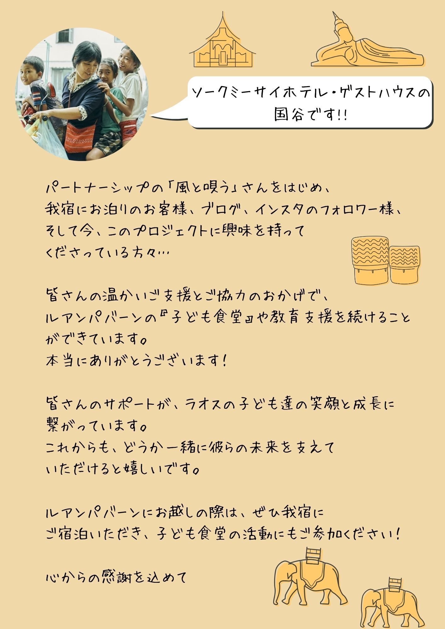 私の店は、ラオスのルアンパバーンにあるソークミーサイホテル・ゲストハウスで始まった「子ども食堂」を支援するために立ち上げました。ルアンパバーンで1人奮闘しているソークミーサイの国谷氏を見て、私も何か力になれないかと常々思っていました。