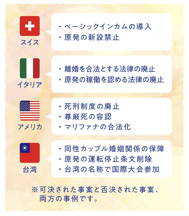 もし日本にこの制度があれば、たとえば「給料から引かれる税金が高いな」と思ったら「所得税」や「雇用保険料」などの引き下げを発案して賛否を問う国民投票にかけることができますし、最近話題になっている「選択的夫婦別姓」や「紙の保険証の廃止」などのテーマでも投票できます。