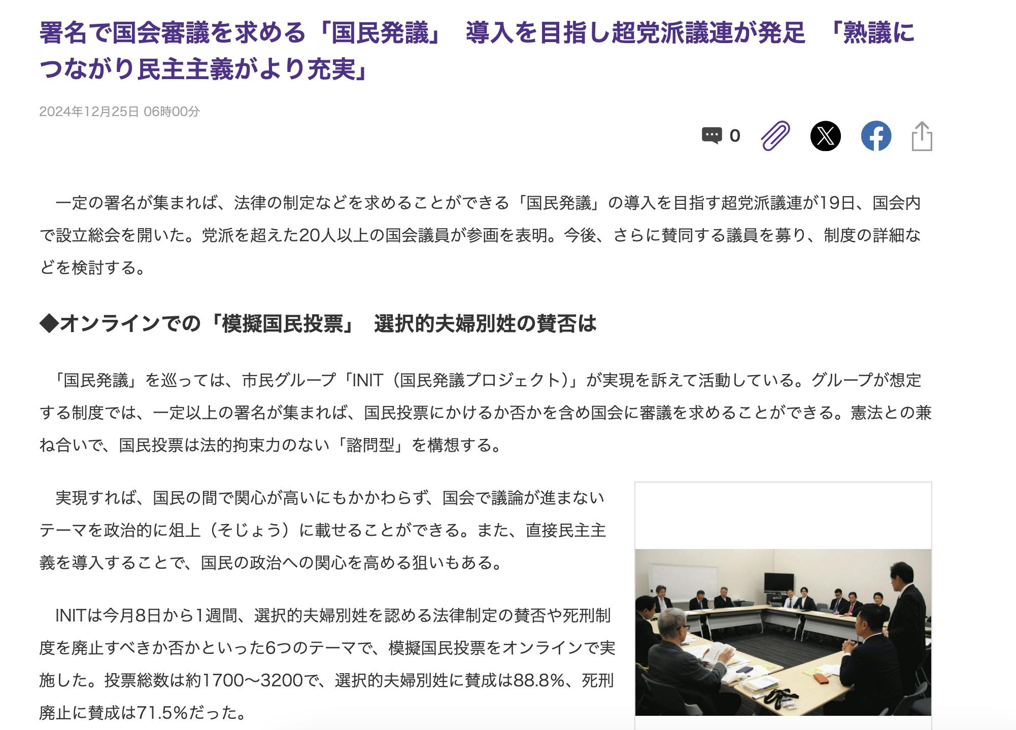 2024/11/24 15:28INIT国民発議プロジェクト 賛同者・支援者のみなさまへ一気に冷え込んできましたがお変わりありませんか。◆11月25日付 東京新聞特報面にINITの活動と国民発議議連を紹介する特集記事が掲載されます。首都圏にお住まいの方は、コンビニやキオスクで御購読のうえ、東京新聞宛てに「よかった」メールをお願いします。反響が大きければ、また私たちの活動を取り上げてくれますので。◆オンライン模擬国民投票 いよいよ24日告示理屈だけではわかりづらい国民発議制度を実感し理解してもらうために、私たちはオンラインでの模擬国民発議、模擬国民投票を実施することにしました。1年間に4回。案件・テーマは計23で、1回目は「選択的夫婦別姓」「消費税」「死刑制度」「紙の保険証」「NHKの受信料」「インボイス制度」の6つです(投票期間は12月8日~14日)。このテーマは、いずれもみなさまから寄せられた声を反映して選んだものです。投票前には公開討論会も行います。模擬とはいえ厳格に管理・運営し、10万人以上の主権者・国民に参加してもらいたいと考えています。つきましては、1千人余の賛同者・支援者のみなさまに、この模擬国民投票に積極的に関わっていただきたく、下記のことをお願い申し上げます。[1]御自身が投票に参加してください。[2]御家族、御友人にこの国民投票のことをPRし投票をよびかけてください。[3]賛成・反対のさまざまな主張 および公開討論会を御確認、御視聴ください。※詳細は、INIT公式ウェブサイト の「模擬国民投票関連の特設ページ」にアクセスしてご確認ください。 もっと見る