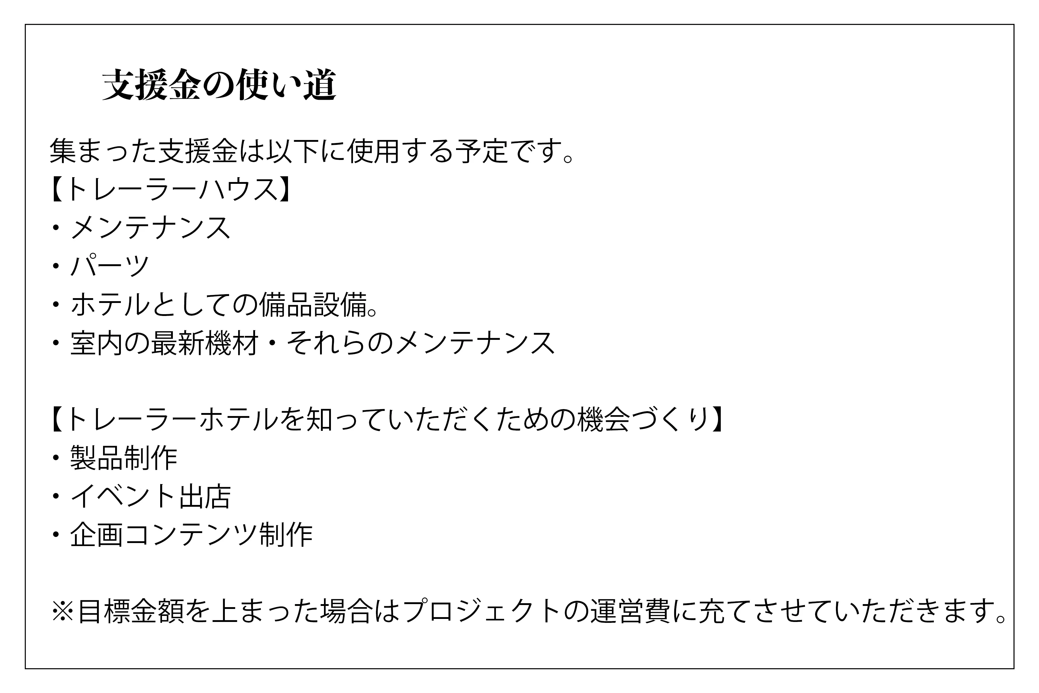 そこでアウトドアをさらに盛り上げるため、日本全国のキャンプ場とRVパークへ向けてボクらが造った「トレーラーハウス」を『トレーラーホテル』としてアウトドアが好きな“アナタ”にご利用していただこうと考え、ご支援のお願いに上がりました!
