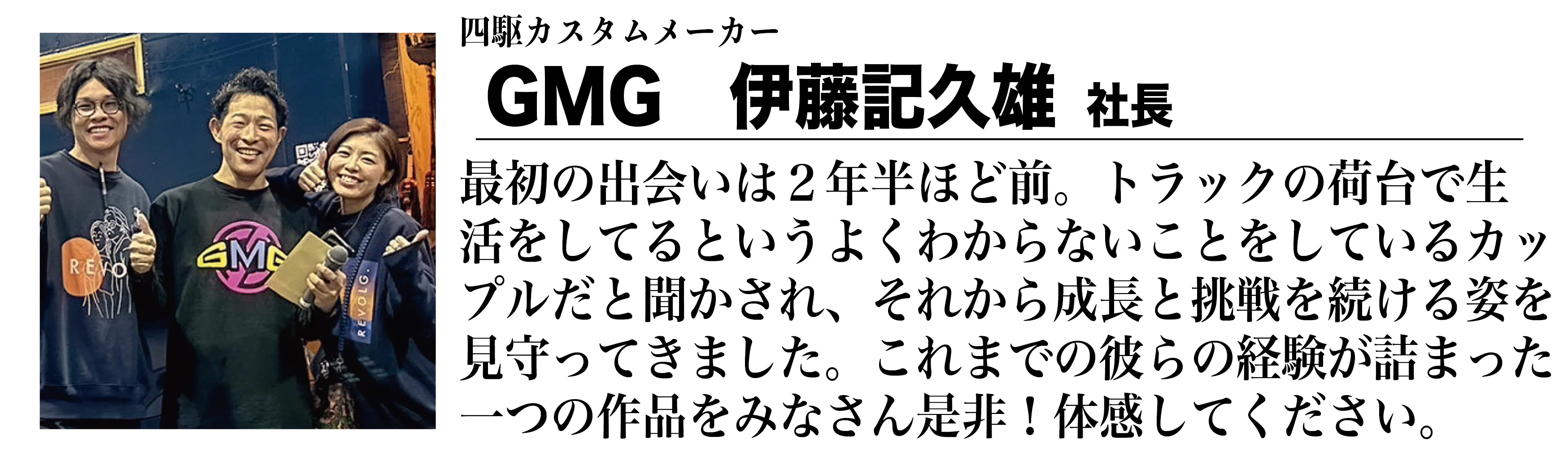 ▲四駆カスタムメーカーGMG 伊藤記久雄社長