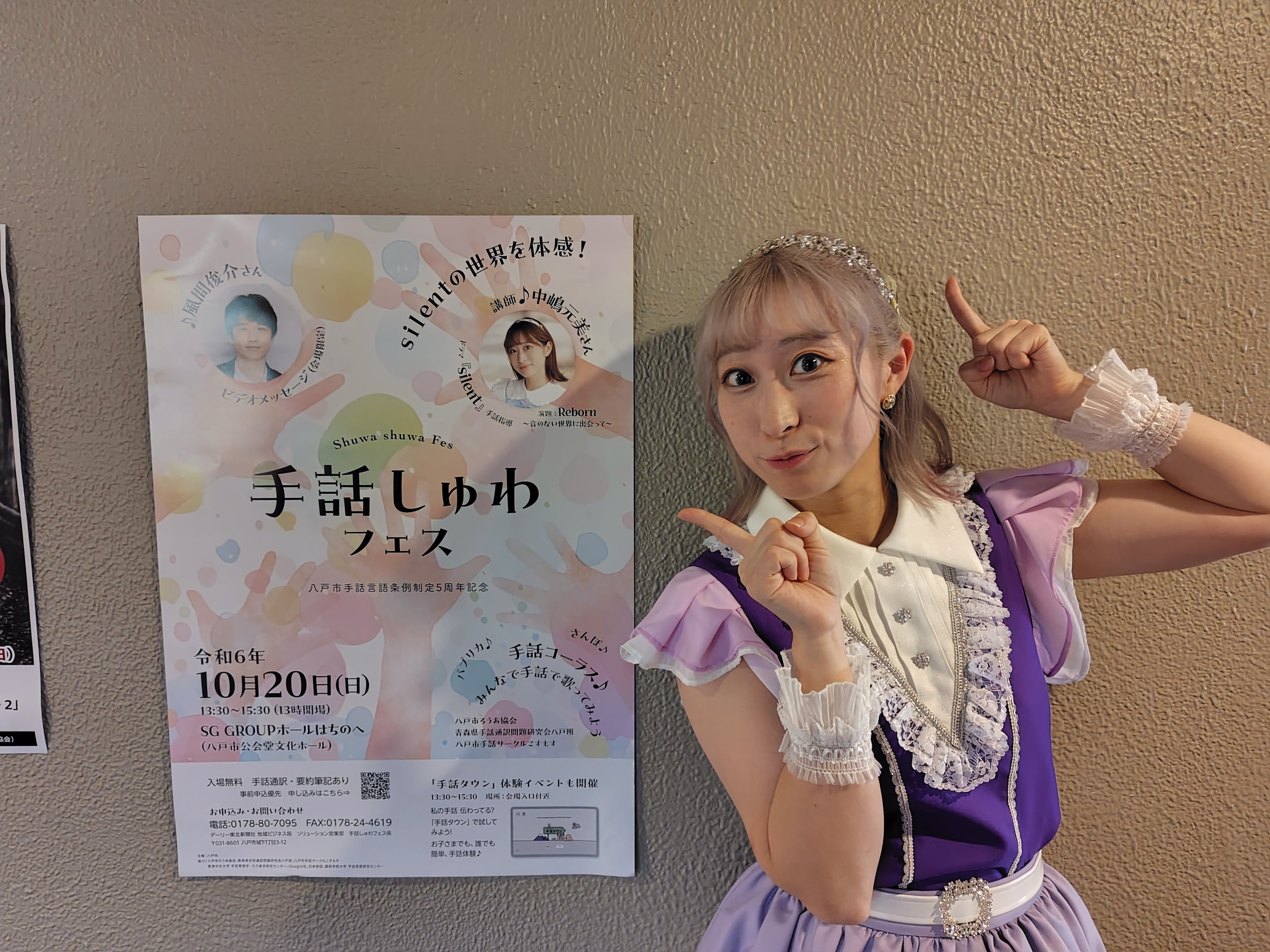 こんばんはハピもちスタッフです!本日は…青森県八戸市八戸市手話言語条例制定5周年記念手話しゅわフェス講演とライブパフォーマンスをさせていただきました!ドラマ「silent」の手話監修・指導を担当したもっちー。主人公の想くんと似た境遇を持つもっちーの経験を楽しくお話させていただきました。講演はアドリブ満載なので、お客様の反応に合わせて色々なエピソードが飛び出します。またどこかでお話させていただく機会がありますように♪そして、講演会とパフォーマンスが同じ日にある特別感を味わえた方は超ラッキー!!ライブパフォーマンスはこちらの6曲をお届けしました!♪つじつま合わせに生まれた僕等♪Subtitle♪Let it go♪にじ♪アイドル♪Reborn〜音のない世界で〜会場のみなさんと一緒に歌うパートがあったり、みんなで盛り上がったり!!オリジナルソング「Reborn〜音のない世界で〜」は講演会のあとに見ると、もっちー作詞の歌詞にいつもよりぐっと入り込めるかも。日本語の歌詞と手話、それぞれの良いところを活かした翻訳、そしてダンス。初めてお会いした方ももっちーの表現力や世界観に感動したと伝えに来てくださったり、小さなお子さんたちがもっちーの笑顔に夢中で手を振ってくれたり。Youtubeのこれが好き!と教えてくださった方もいらっしゃいました。聞こえる方からも聞こえない方からも素敵なメッセージをいっぱいいただいたもっちーなのでした。さてさて、次のイベントはついに11/14のワンマンライブ!!台風の影響で8月から延期になったライブが遂にやってきます!パフォーマンスに磨きをかけ、そして、今のもっちーの魅力を存分に伝えられるように演目も夏からさらにパワーアップ!!もっちーわーるど全開のワンマンライブ、ぜひ遊びに来てくださいね♪