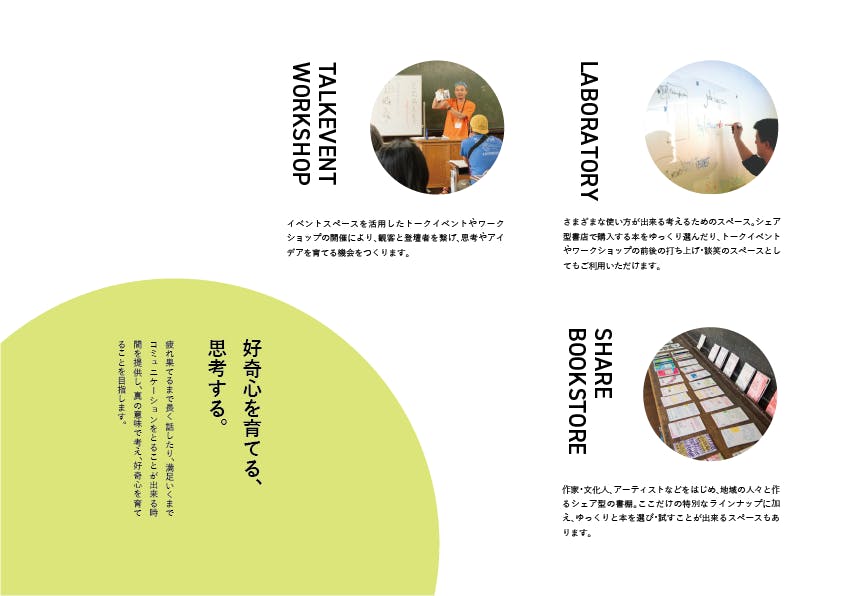 ・シェア型書店:複数の棚・区画を異なる棚主が担当出品しながら、みんなで運営する書店。施設内でゆっくり本を読むことが出来ます。