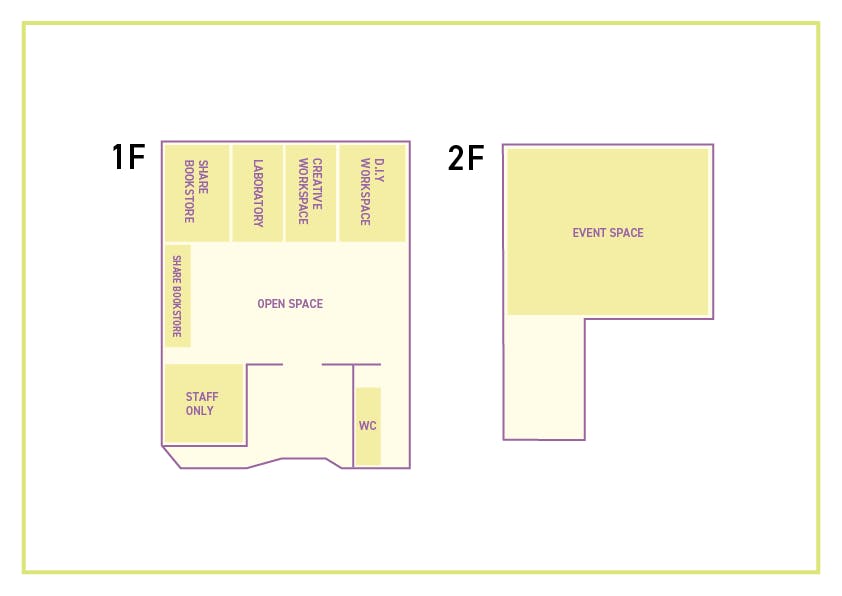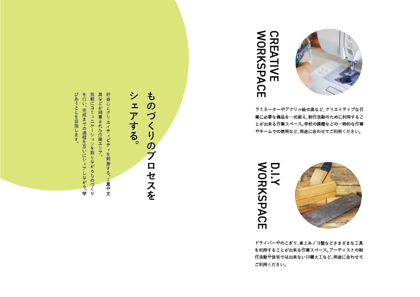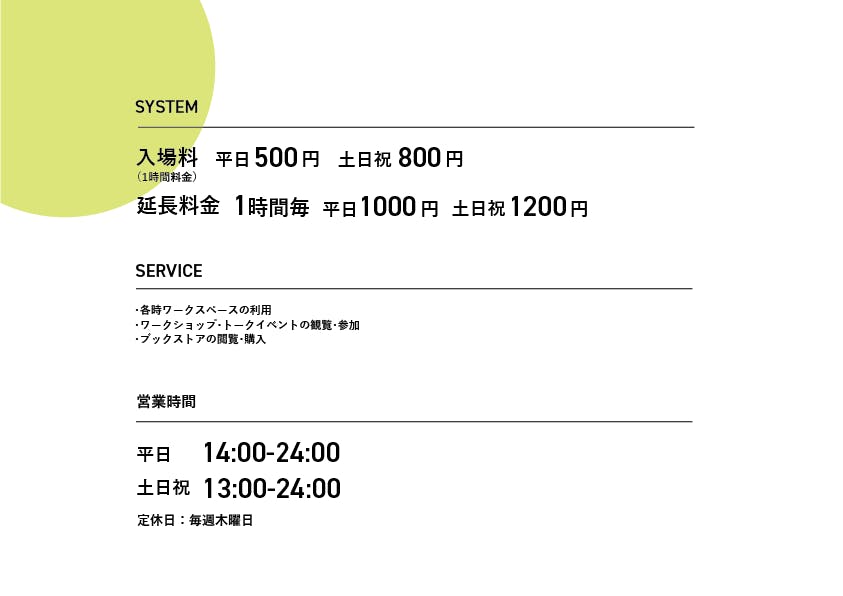 ・イベントスペース:ワークショップやトークイベントなどを定期開催するイベントスペースです。開催している各イベントに参加することが出来ます。