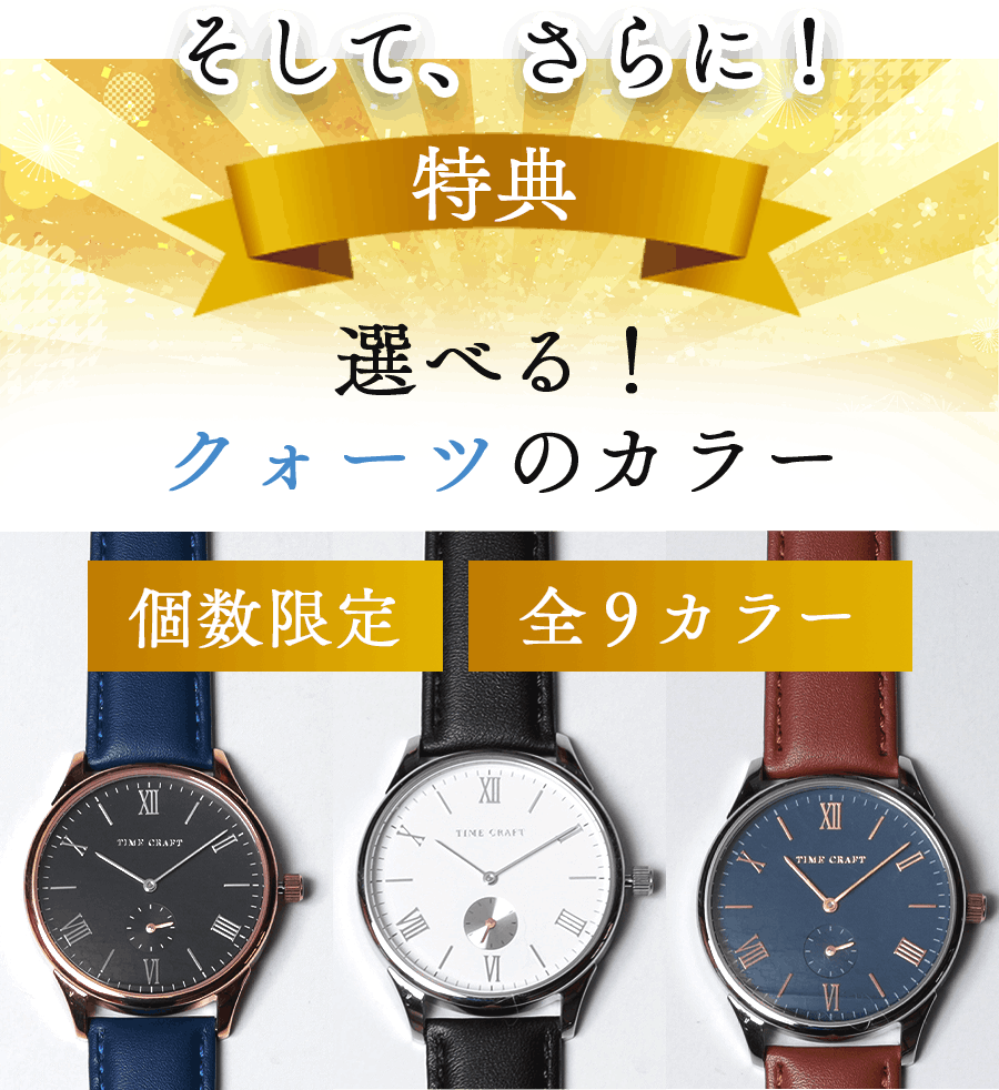 この度は、弊社キャンペーンにご興味を頂き誠にありがとうございます。弊社は、happy life for you ~良品をあなたへ~を理念として日本で未発売の海外の素晴らしい商品を日本の皆様にお届けする事を事業としています。この度、英国のTimecraft様の協力のもと手作り腕時計を日本先行販売する事となりました。日本の皆様にきっと幸せをお届け出来る商品だと自負しております。また、キャンペーン終了後には迅速で丁寧な配送を心掛けますのでどうか皆様宜しくお願い致します。