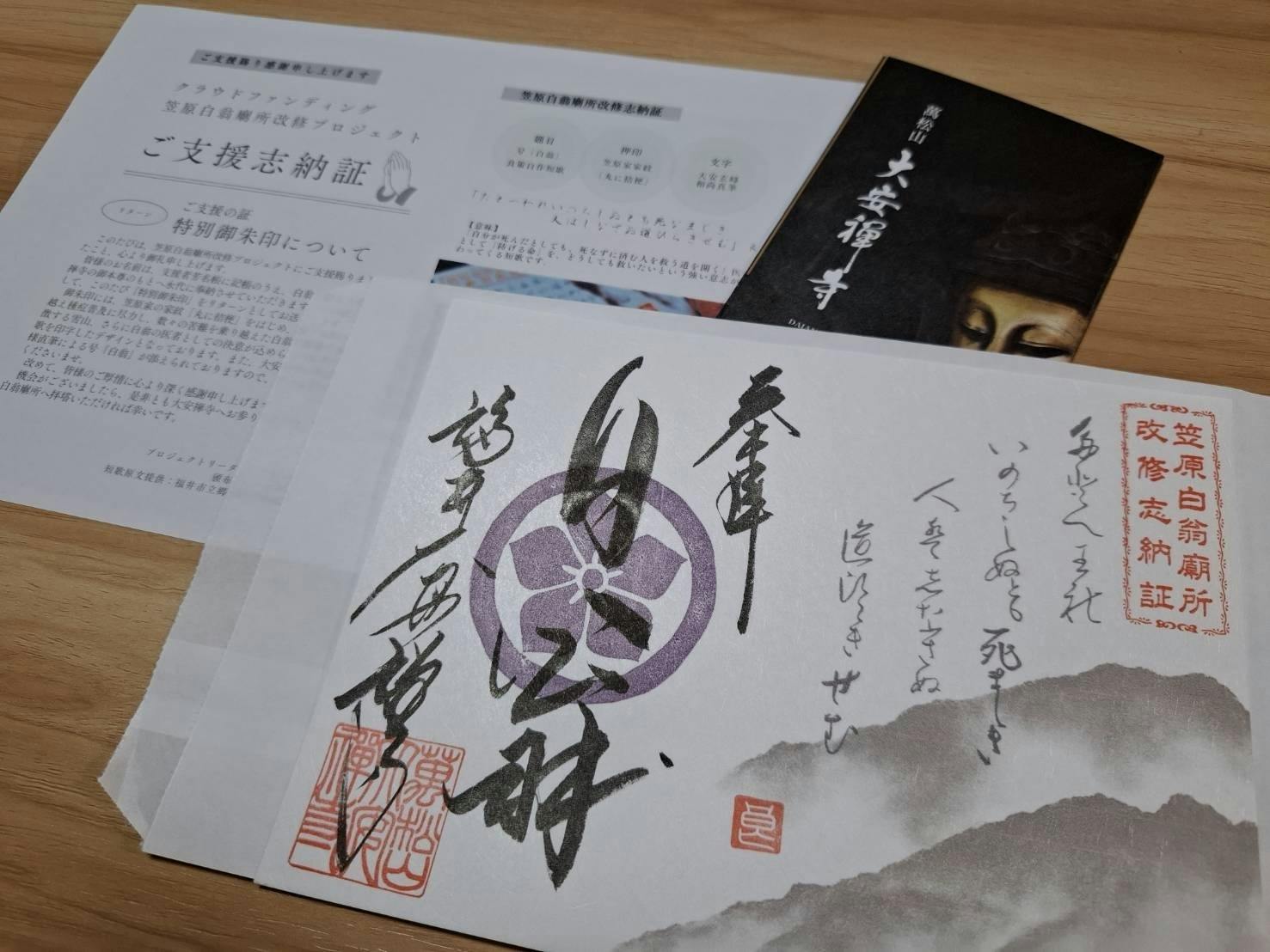 御朱印は、現在、大安禅寺高橋玄峰副住職の直筆で、一枚一枚、心を込めて手書きしていただいており、準備が進んでおります。