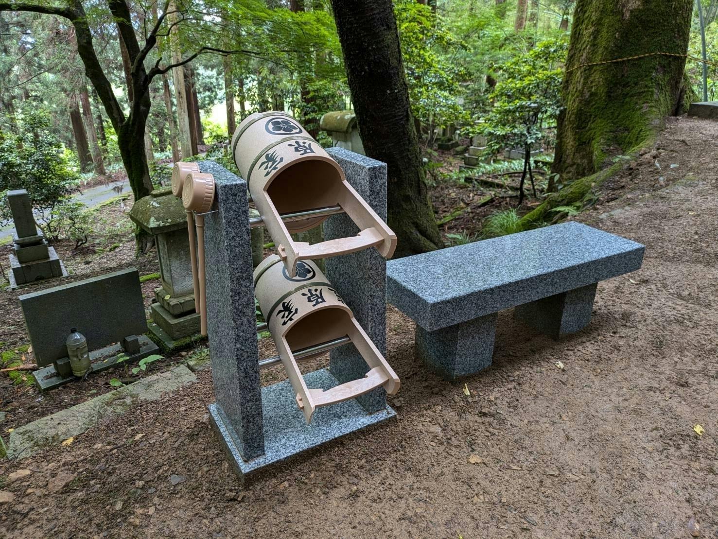 廟所の環境整備の一つとして、水汲み用の柄杓と手桶の台を設置させて頂きました。また、参られた方々が腰掛けたり、手荷物を置く場所に利用頂ければ幸いです。
