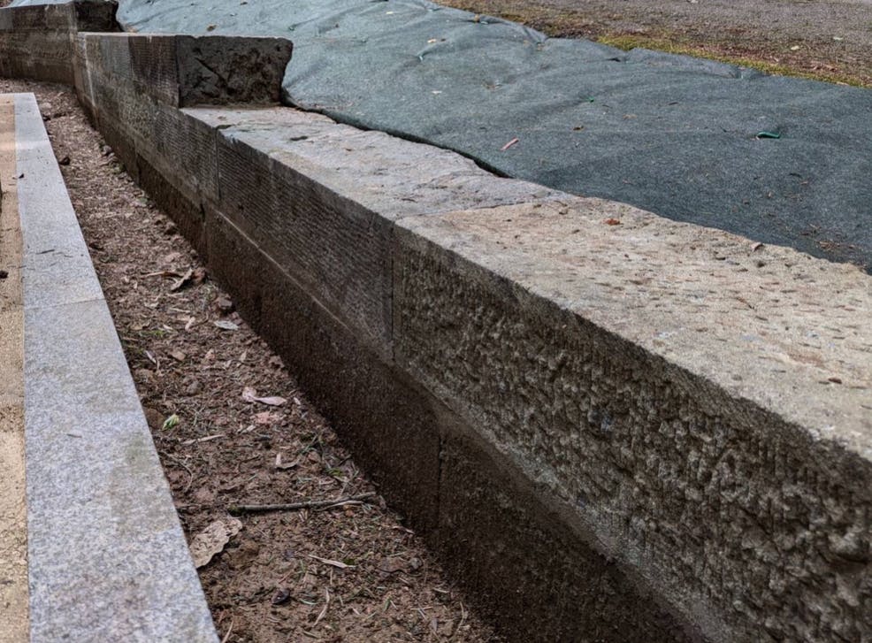 笏谷石の古材の石積により、これまで悩まされた雨水によるお墓への侵食を防ぐと同時に、積み上がった古材が歴史の重みを感じさせ、白翁のお墓をより引き立てています。