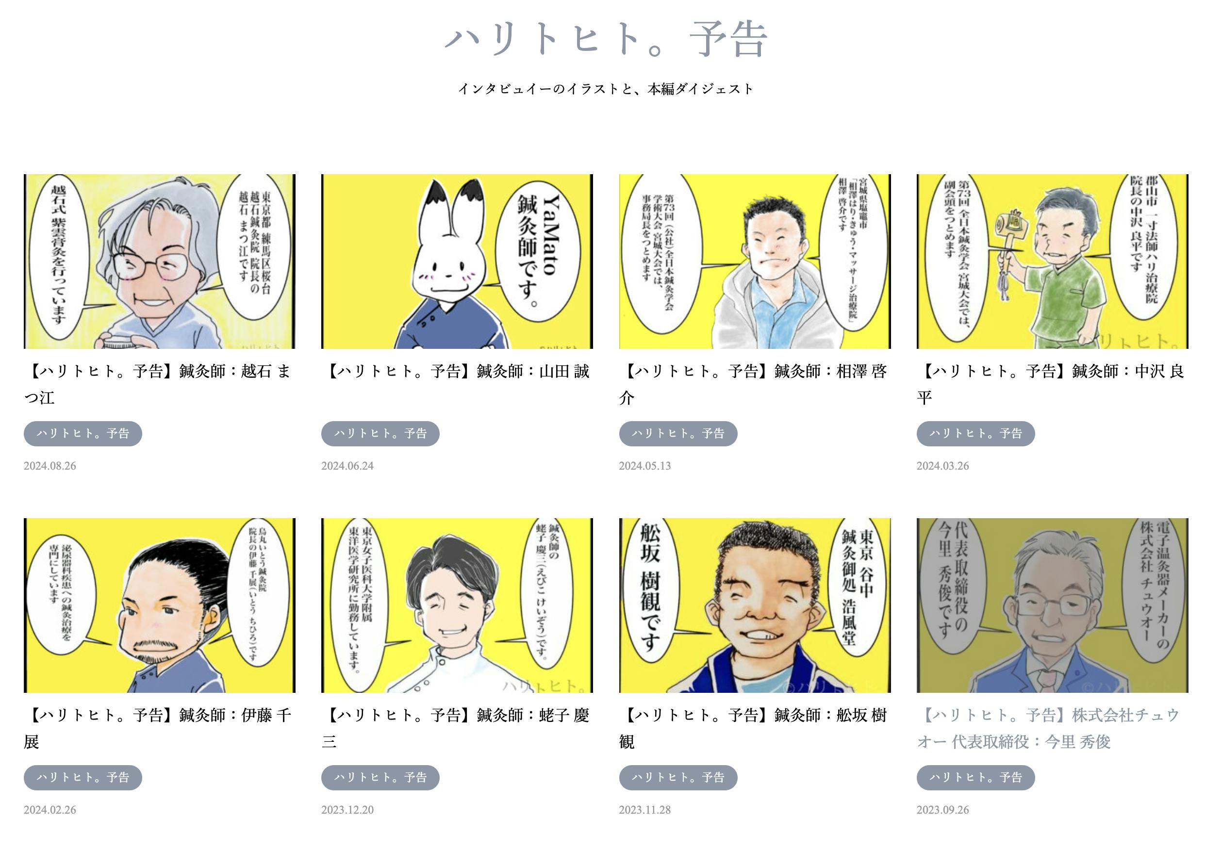 ハリトヒト。は購読無料のwebメディアです。運営は、鍼灸師を中心とした有志がおこなっています。アクセスをしていただければ、鍼灸業界のヒトたちのチャーミングで味わい深い、実体験に基づいたインタビューが並んでいます。加えて、鍼灸師の学びにつながる学術的な記事も人気のコンテンツになっています。