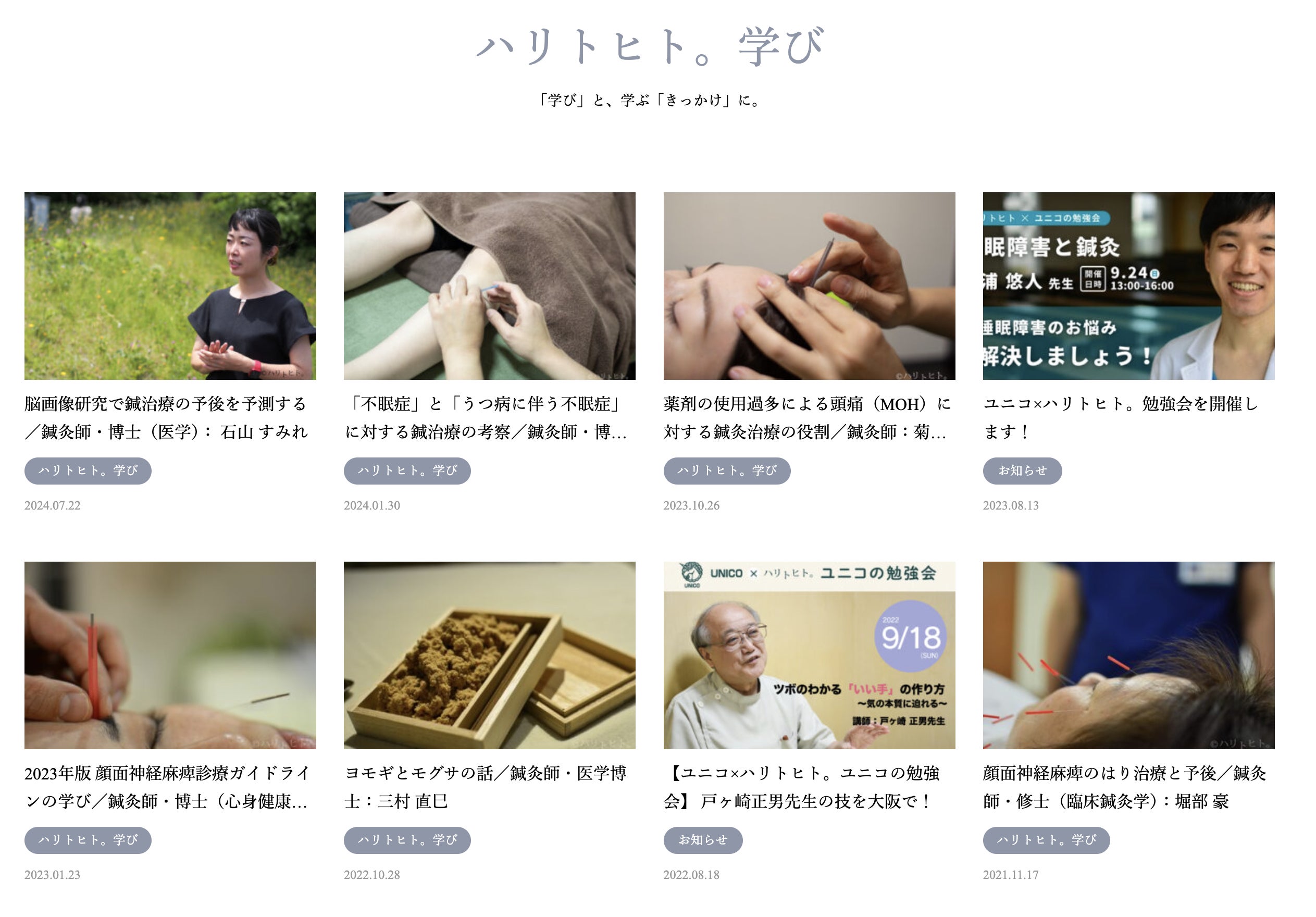 ハリトヒト。は購読無料のwebメディアです。運営は、鍼灸師を中心とした有志がおこなっています。アクセスをしていただければ、鍼灸業界のヒトたちのチャーミングで味わい深い、実体験に基づいたインタビューが並んでいます。加えて、鍼灸師の学びにつながる学術的な記事も人気のコンテンツになっています。